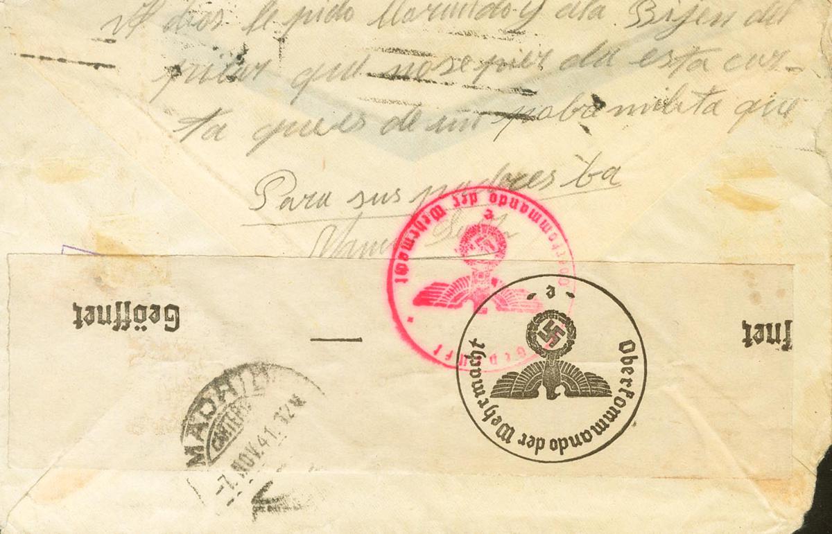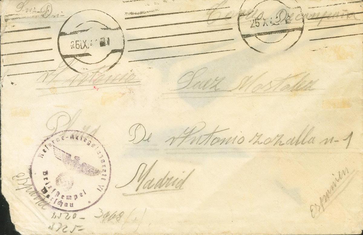 1941. HOSPITAL DE GUERRA DE VARSOVIA (25 de Octubre). Dirigida a MADRID, remitida por un Divisionario internado en el Hospital de Guerra VI de Varsovia. Fechador de rodillo mudo y marca RESERVE KRIEGSLAZARETT VI / ARIEFSTEMPEL / WARCHAU, en negro, al dorso anotación curiosa del remitente y llegada. MAGNIFICA Y RARA.