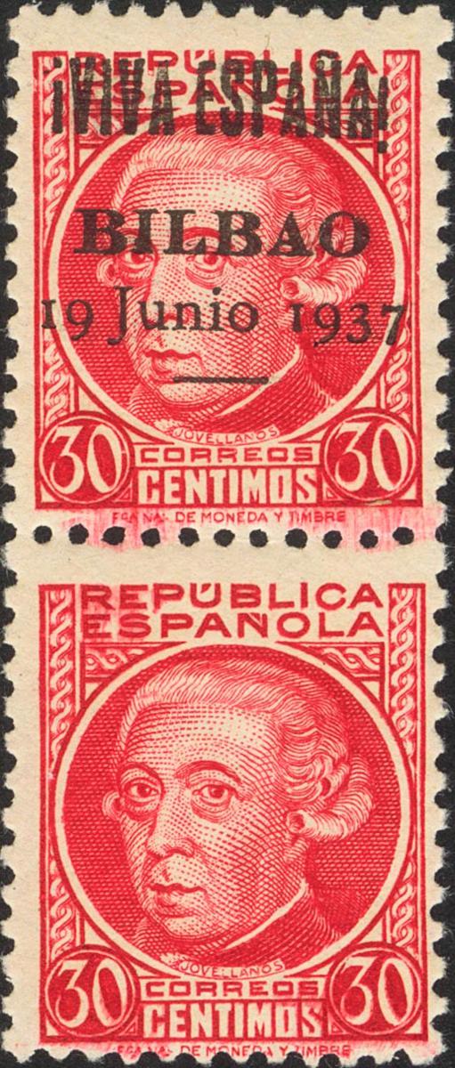 ★★ 8hpv. 1937. 30 cts carmín, pareja vertical. Un sello SIN SOBRECARGA. MAGNIFICA. Edifil 2017: 33 Euros