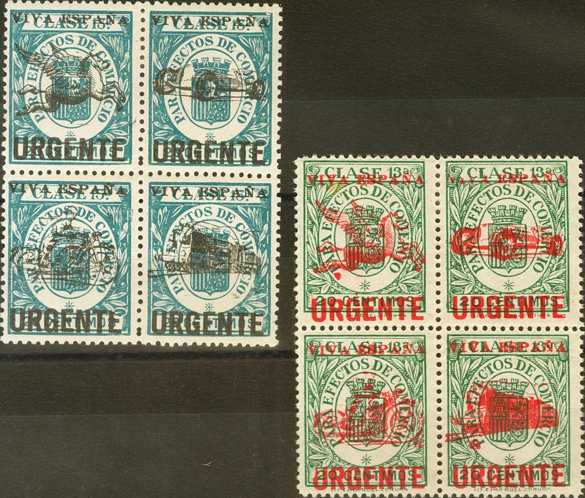 ★★/★ 83B(4), 87B(4). 1937. Dos bloques de cuatro incluyendo las series con las sobrecargas en negro y rojo. MAGNIFICOS E INUSUALES. Edifil 2017: 200 Euros