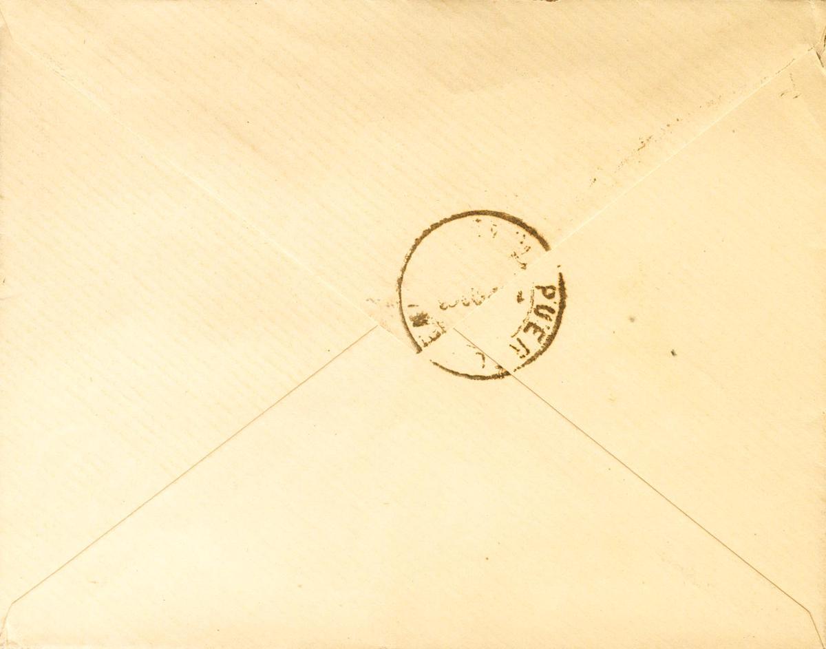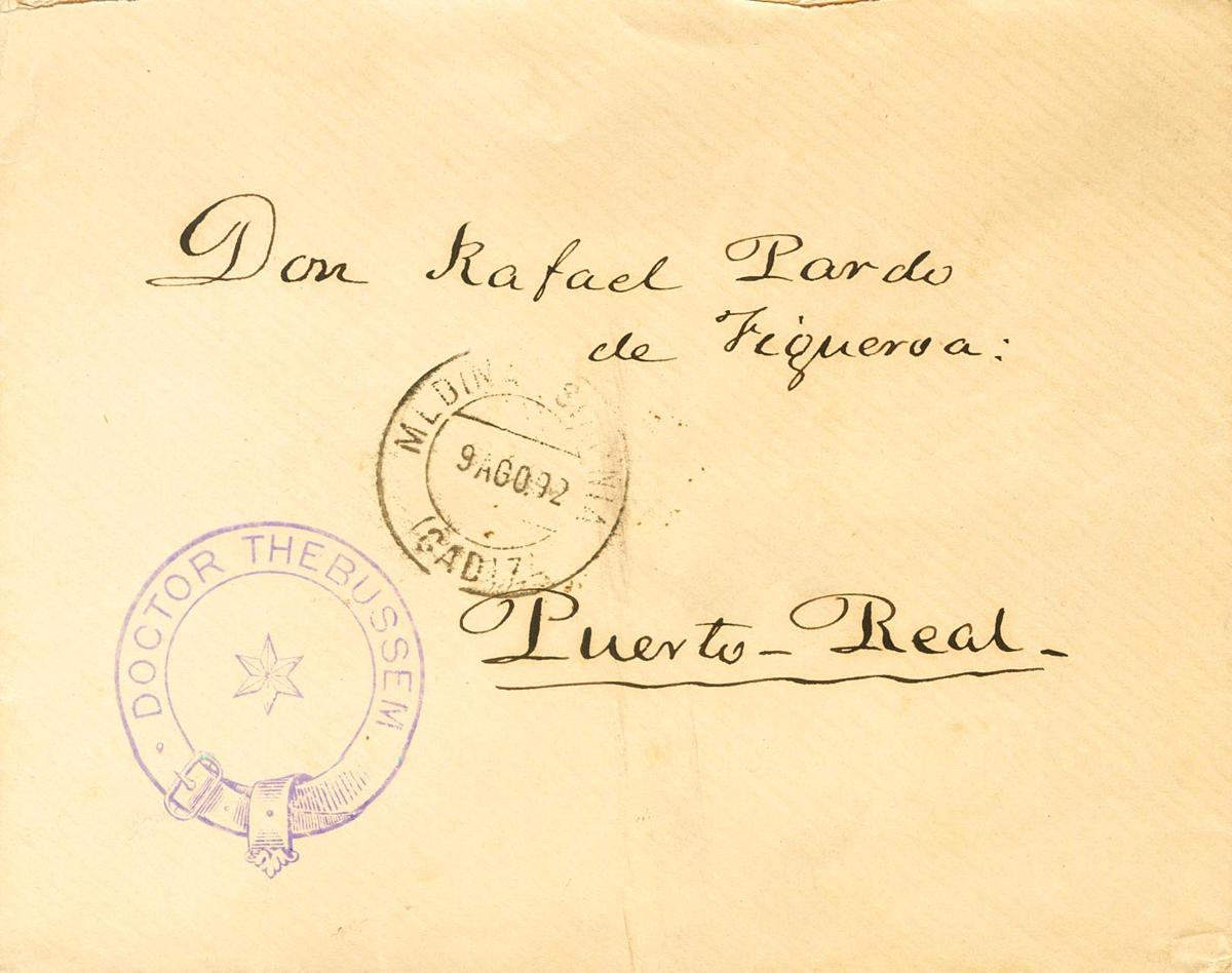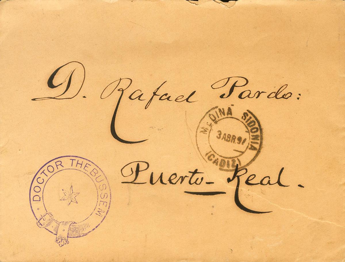 6(2). 1892. Conjunto de dos cartas (una de ellas rasgada en el frente) de MEDINA SIDONIA a PUERTO REAL, ambas con la marca de franquicia DOCTOR THEBUSSEM, en violeta y al dorso llegada. MAGNIFICAS.