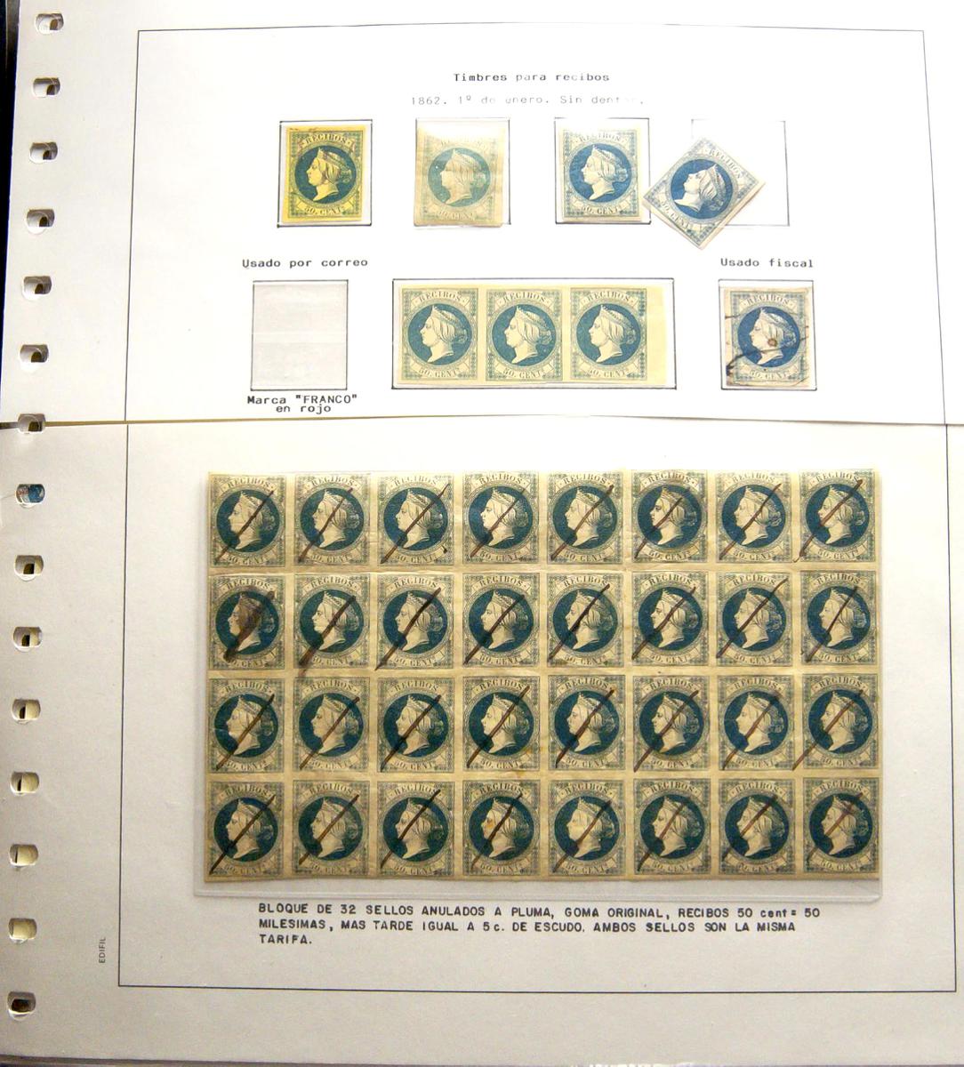 ★/(1862ca). Espectacular conjunto-colección de fiscales de RECIBOS entre 1862 y 1882, en nuevo y usado, incluye decenas de documentos de diversos tipos (nóminas, recibos, facturas, pagarés, etc), así como variedades, grandes bloques, usos postales y algún ensayo de color. MERECE UN DETENIDO EXAMEN POR SU ALTO NIVEL DE ESPECIALIZACION. IMPRESCINDIBLE EXAMINAR. Ex-Alemany.