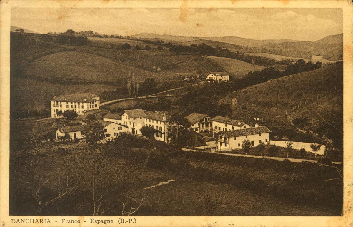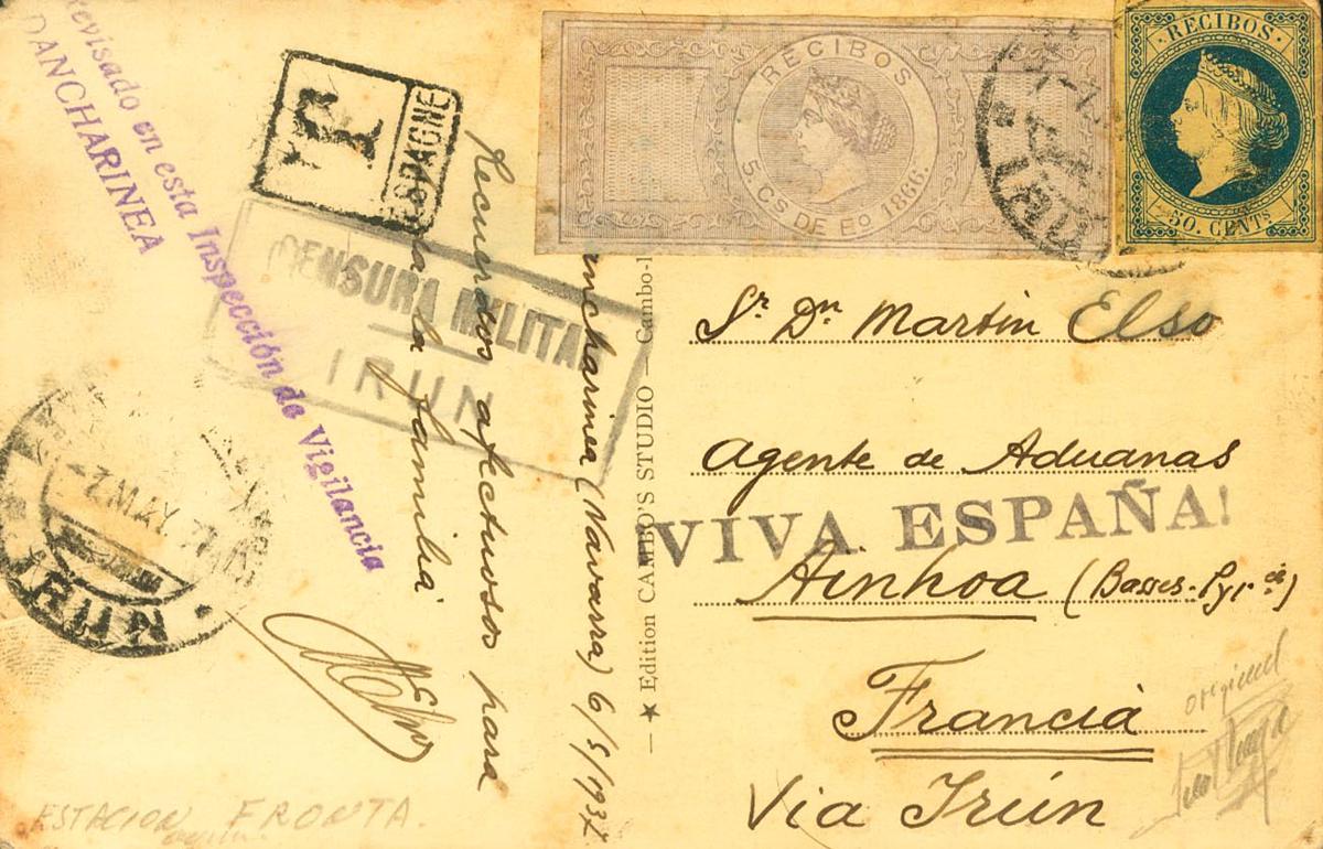 1937. 50 cts azul sobre amarillo de 1861 y 5 cts lila pálido de 1866, ambos de RECIBOS. DANCHARINEA (NAVARRA) a AINHOA (FRANCIA), circulada vía Irún a pesar de que entre estas poblaciones sólo hay tres kilómetros. MAGNIFICA Y RARISIMO USO DE SELLOS FISCALES DEL SIGLO XIX EN 1937. (Alemany 1, 2)