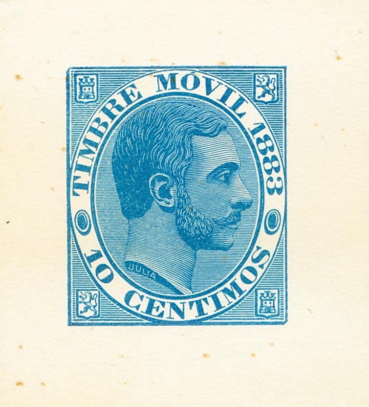 (★)1883. 10 cts azul TIMBRE MOVIL (1883). PRUEBA DE PUNZON. MAGNIFICA Y RARA. (Alemany P-4, Gálvez F32)