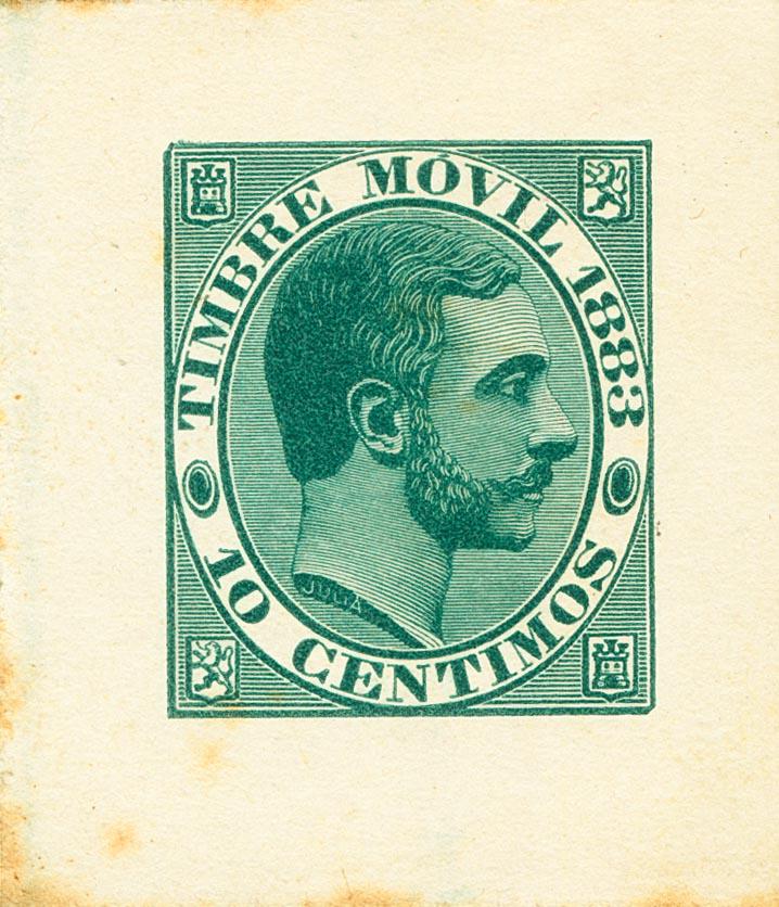 (★)1883. 10 cts verde (manchitas del tiempo) TIMBRE MOVIL (1883). PRUEBA DE PUNZON. BONITA Y RARA. (Alemany P-5, Gálvez F33)