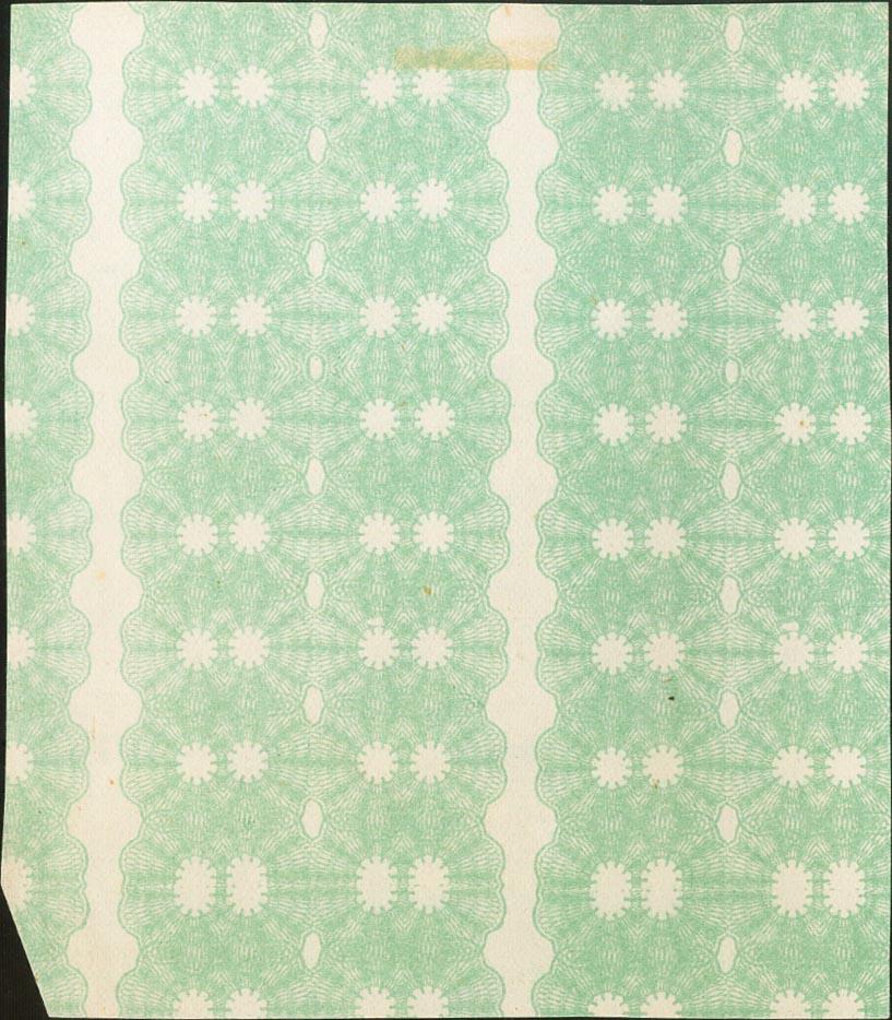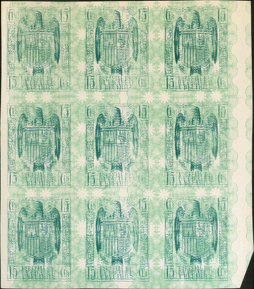 (★)1939. 15 cts verde FACTURAS, bloque de nueve. ENSAYO DE COLOR (doble impresión), sobre papel con fondo de seguridad. MAGNIFICO. (Alemany 38)