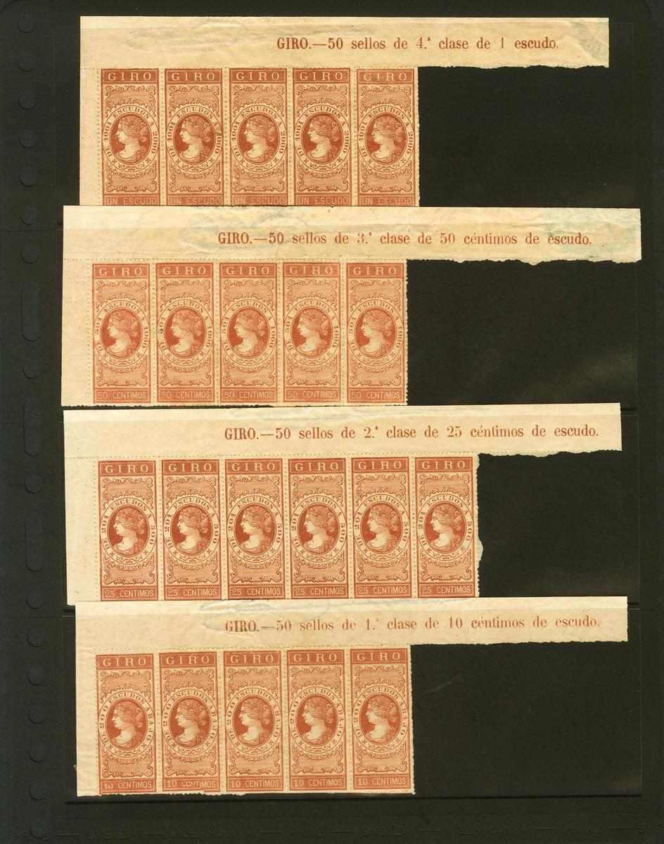 (★)1867. Serie completa GIRO, tira de cuatro (de algún valor hay hasta seis unidades), esquina de pliego con leyenda. Procedentes de la hoja Muestra. BONITA Y RARA. (Alemany 22/42)