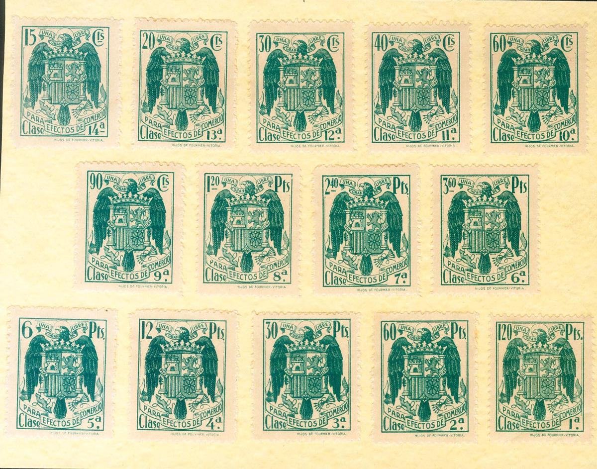 (★)1937. Serie completa EFECTOS DE COMERCIO, catorce valores y sobre cartulina MUESTRA. MAGNIFICA Y RARISIMA. (Alemany 162/75)