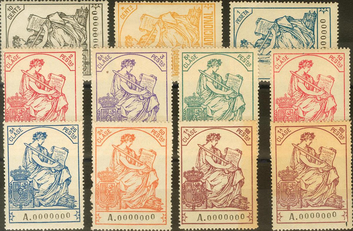 ★1910. Serie completa POLIZAS, a falta del 50 cts carmín (clase adicional). NºA000000. MAGNIFICA Y RARISIMA. (Alemany 562/73)