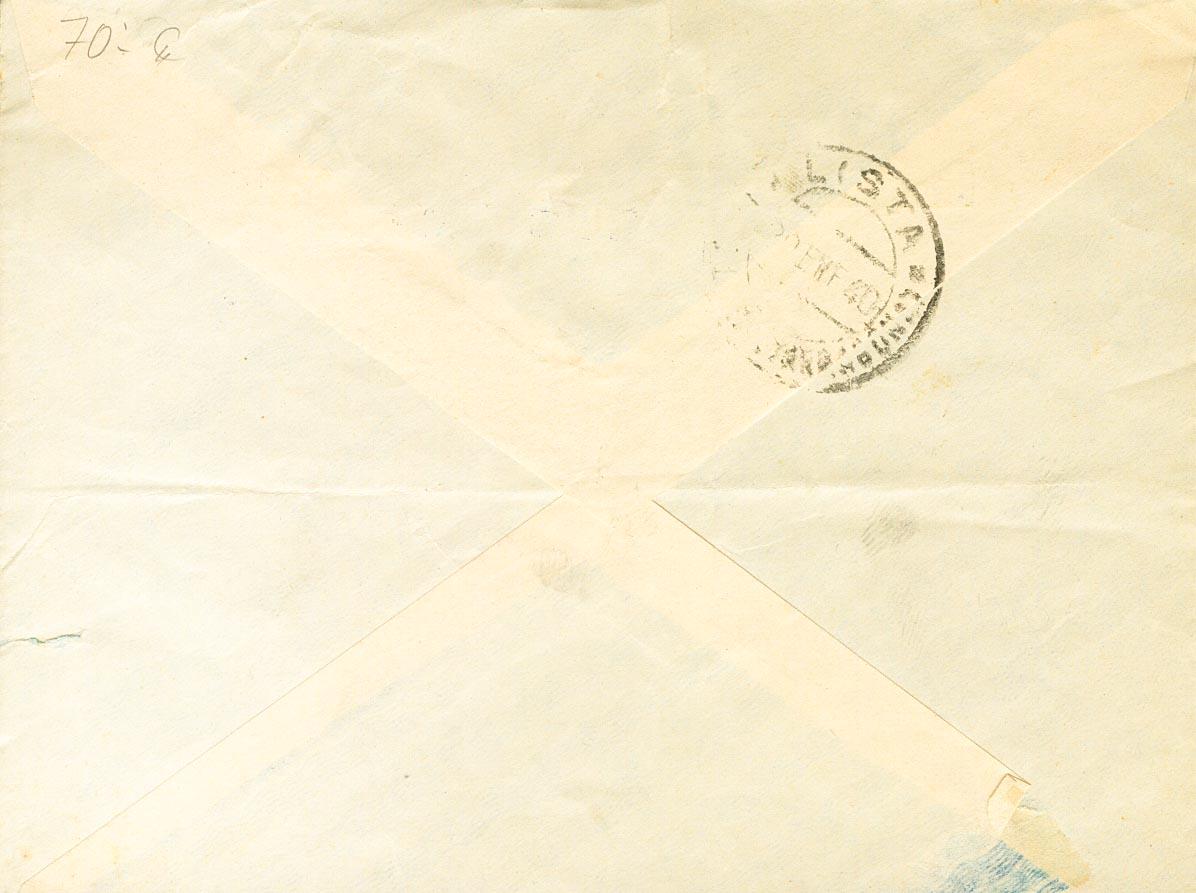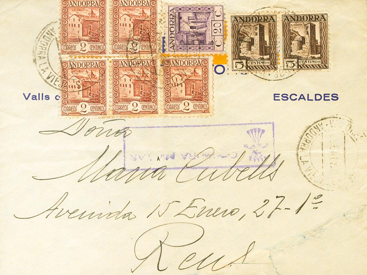 28(5), 29(2), 34. 1940. 2 cts castaño, cinco sellos, 5 cts castaño oscuro, dos sellos y 20 cts violeta. ANDORRA LA VIEJA a REUS. Al dorso llegada. MAGNIFICA.