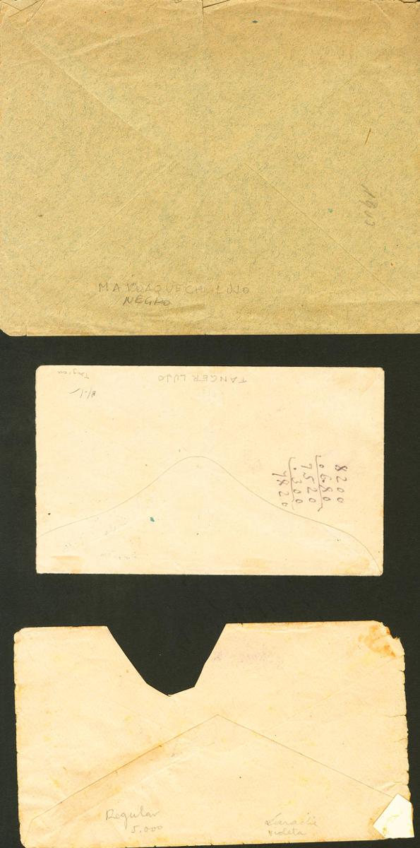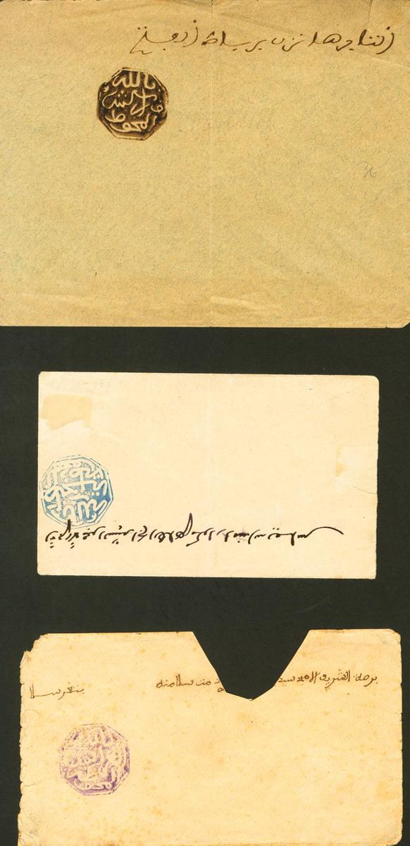 (1892ca). Tres cartas (una con falta de papel) con marcas hexagonales del Maghzen de Larache, en violeta, Tánger, en azul y Marrakech, en negro. BONITAS.