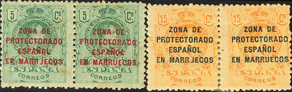 ★ 59/59ha, 61/61ha. 1916. 5 cts verde y 15 cts amarillo, pareja. Un sello variedad "U" ROTA. BONITAS Y RARAS.