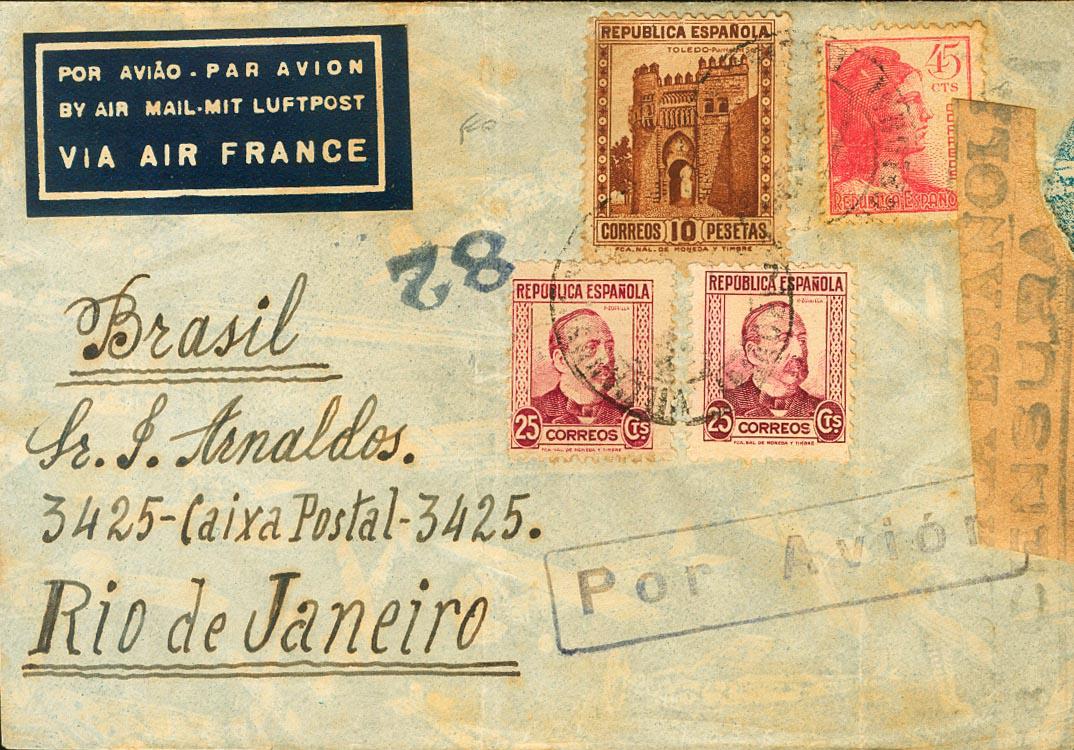 675, 685, 752. 1938. 10 pts castaño, 25 cts carmín, dos sellos y 45 cts rosa. VILANOVA Y LA GELTRU a RIO DE JANEIRO (BRASIL). MAGNIFICA.
