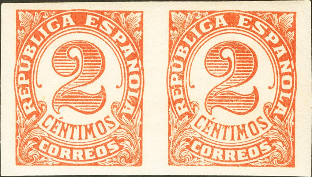 ★ 678s(2). 1933. 2 cts castaño rojo, pareja (dos puntitos de óxido, sin importancia). SIN DENTAR. MAGNIFICA. Edifil 2022: 88 Euros