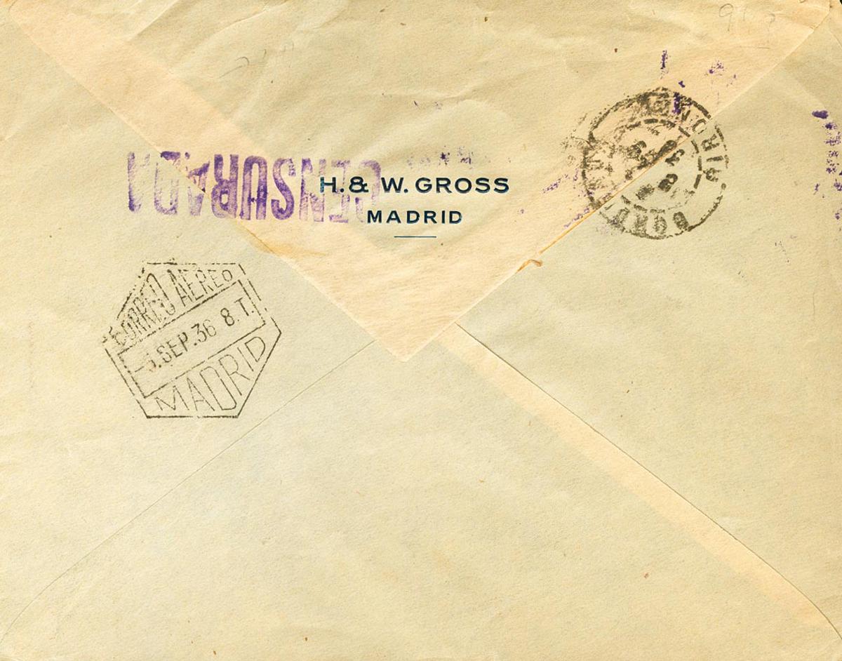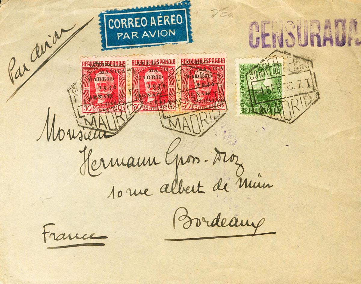 741(3), 682. 1936. 30 cts rojo, tres sellos (tonalizados) y 10 cts verde. Correo Aéreo de MADRID a BURDEOS (FRANCIA). Al dorso llegada. MAGNIFICA.