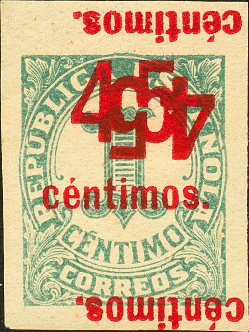 ★ 742shhi. 1938. 45 cts sobre 1 cts verde. SIN DENTAR, SOBRECARGA DOBLE, UNA INVERTIDA y "CENTIMOS" EN LA PARTE SUPERIOR. MAGNIFICO Y RARO.
