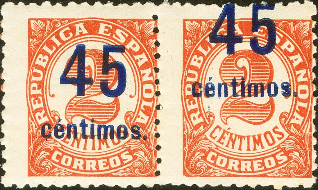 ★★ 743(2). 1938. 45 cts sobre 2 cts castaño rojo, pareja. Un sello SOBRECARGA DESALINEADA. MAGNIFICA.