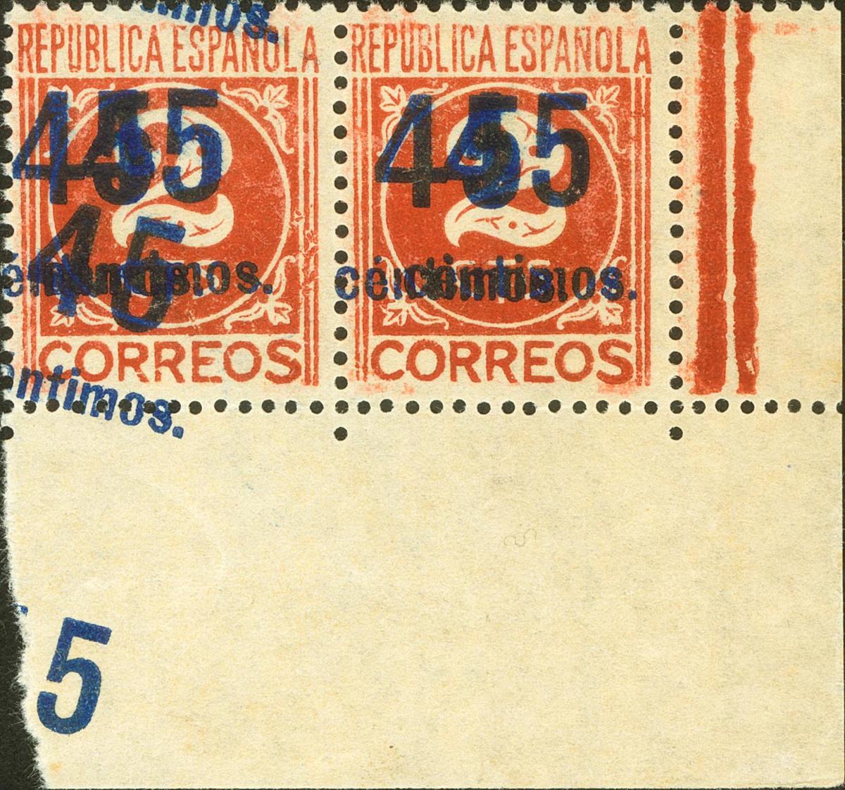 ★ 744hh, 744hhhx. 1938. 45 cts sobre 2 cts castaño, pareja, esquina de pliego. Un sello SOBRECARGA DOBLE y el otro SOBRECARGA TRIPLE, UNA EN DIAGONAL. MAGNIFICA.