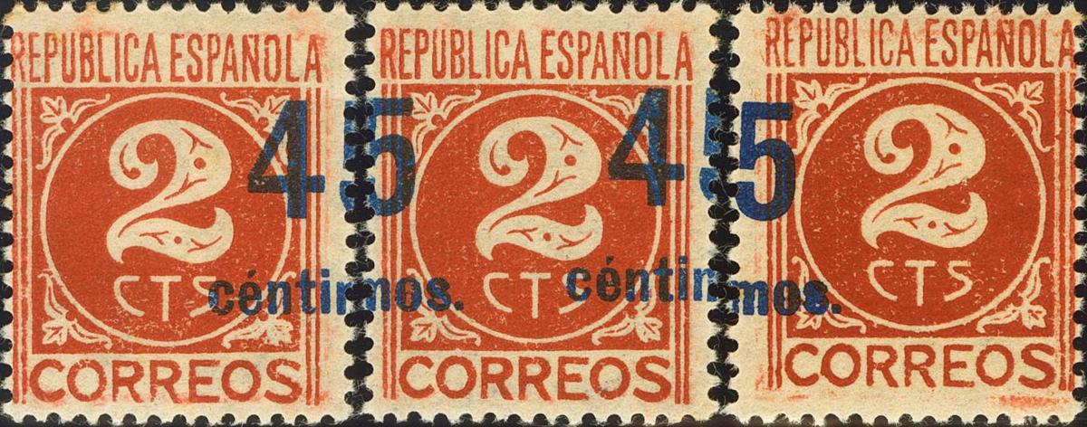 ★★/★ 744(3). 1938. 45 cts sobre 2 cts castaño, tres sellos. SOBRECARGA DESPLAZADA HORIZONTALMENTE, en tres posiciones diferentes. MAGNIFICOS.