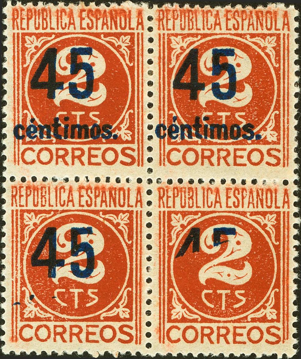 ★ 744(4). 1938. 45 cts sobre 2 cts castaño. bloque de cuatro. Un sello SOBRECARGA PARCIAL. MAGNIFICO.