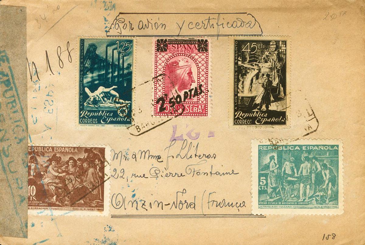 773/74, 791. 1938. Serie completa, 2´50 pts sobre 25 cts y sellos de Beneficencia de 5 cts y 10 cts. Certificado de BARCELONA a ANZIM-NORD (FRANCIA). Al dorso llegada. MAGNIFICA.