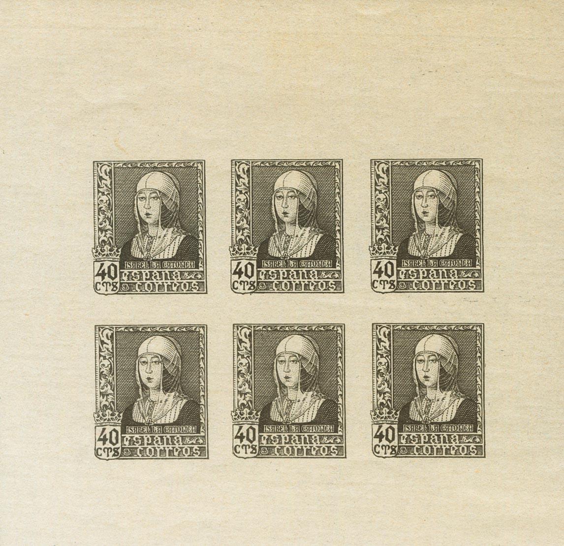 ★ 858P(6). 1938. 40 cts negro, bloque de seis. PRUEBA DE REPORTE. MAGNIFICA Y RARISIMA. (Gálvez 3556)