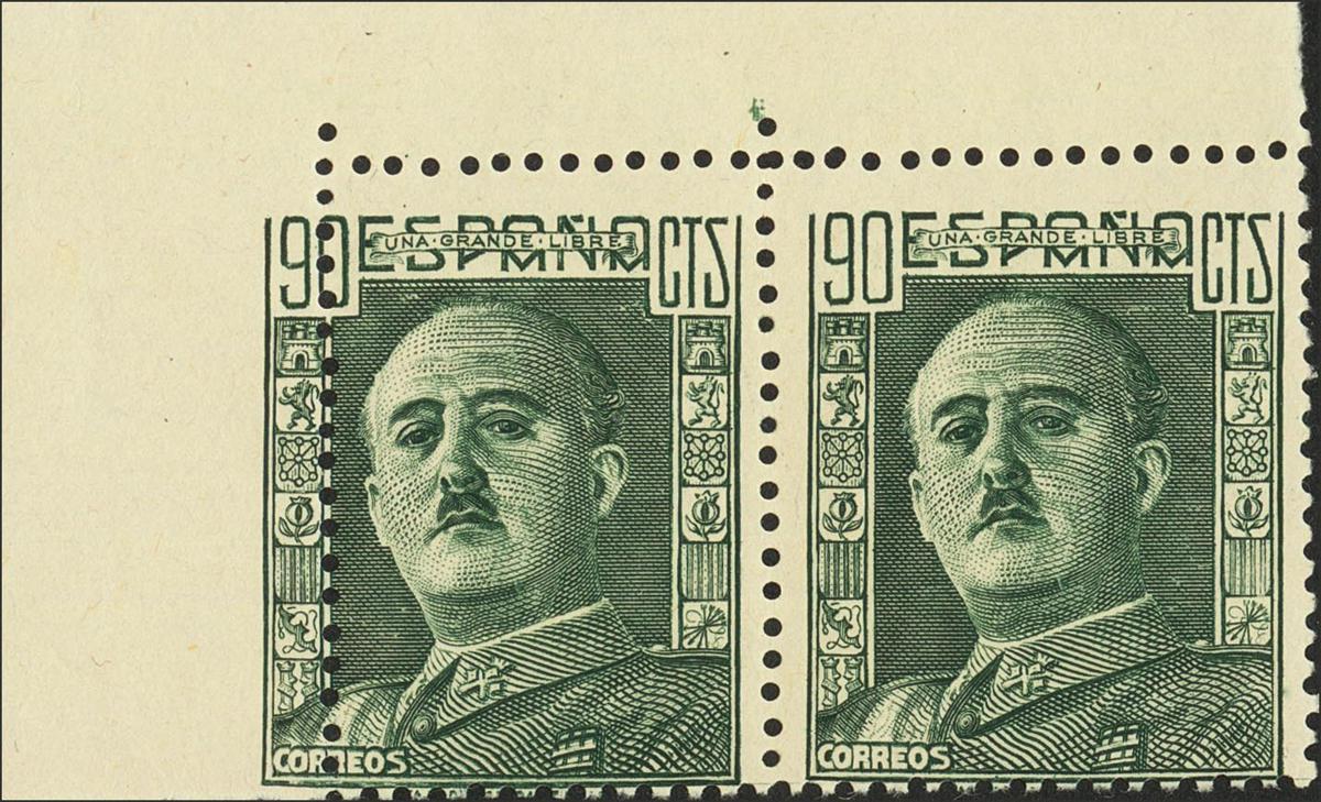 ★★ 1060. 1949. 90 cts verde, pareja. Un sello DENTADO VERTICAL DESPLAZADO. MAGNIFICA Y RARA, MUY ESPECTACULAR.