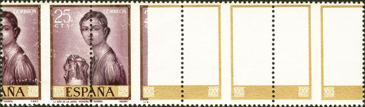 ★★ 1657dh(2). 1965. 25 cts burdeos, dos sellos y dos impresiones del marco. DENTADO DESPLAZADO. MAGNIFICA Y RARA.