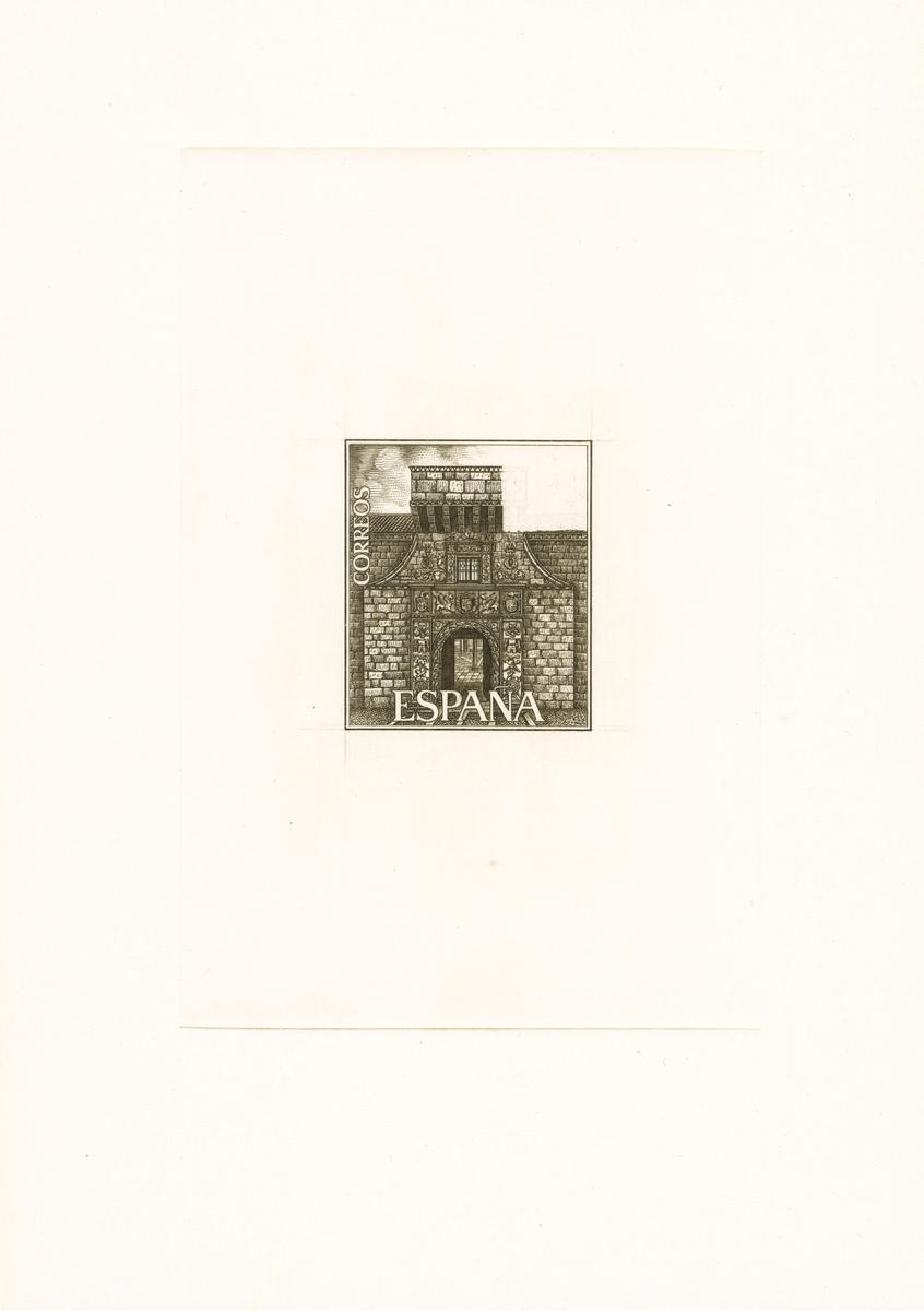 (★)(1977ca). Sin valor, negro. PRUEBA DE PUNZON, de un diseño no adoptado de la Puerta de la Academia de Administración Militar de Avila con el cartucho del valor en blanco. MAGNIFICA Y RARISIMA.
