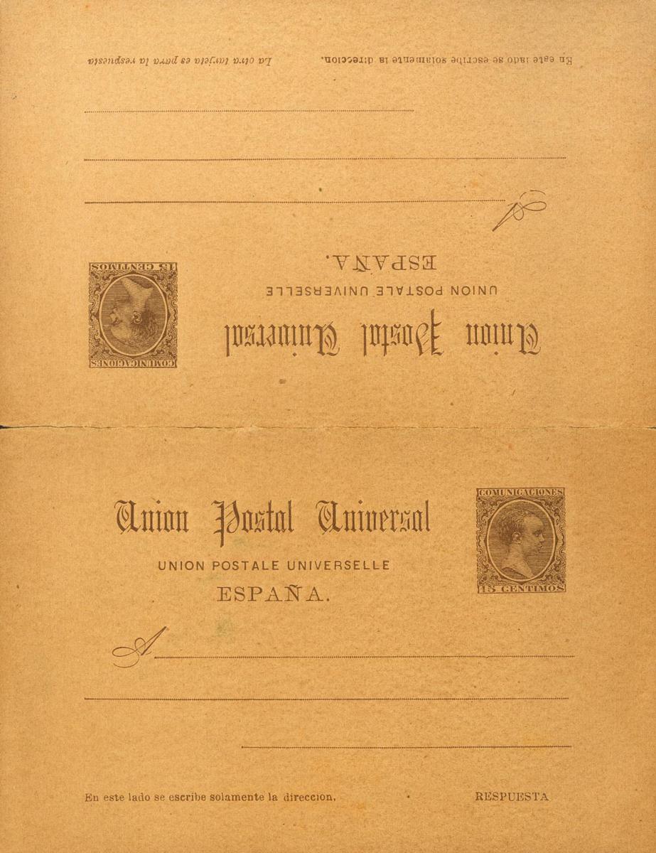 (★) EP24. 1889. 15 cts+15 cts castaño sobre Tarjeta Entero Postal, de ida y vuelta (desprendida y reforzada en el centro). BONITA Y RARISIMA. Edifil 2022: 2.000 Euros