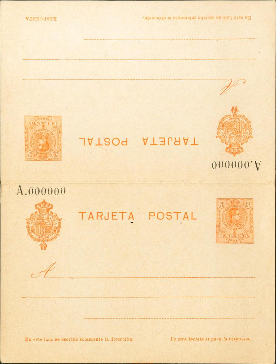 (★) EP52N. 1910. 20 cts+20 cts naranja sobre Tarjeta Entero Postal NºA000000, de ida y vuelta. MAGNIFICA. Edifil 2017: 116 Euros