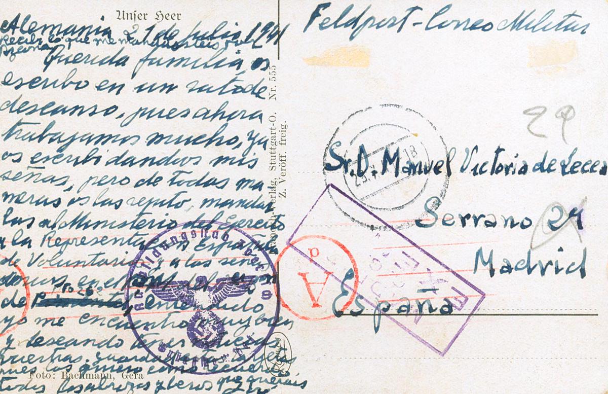 1941. LOS PRIMEROS DIAS-CAMPAMENTO DE GRAFENWÖHR (21 de Julio). GRAFENWÖHR (ALEMANIA) a MADRID. Fechador mudo alemán, marcas AUSBILDUNGNSSTAB FOERLICH / BRIEFSTEMPEL y rodillo A / D, en rojo, en el texto el remitente indica que le escriban al Ministerio del Ejército, Representación Española de Voluntarios, aún no estaban asignados los números de Correo de Campaña (Feldpost). MAGNIFICA Y RARA.