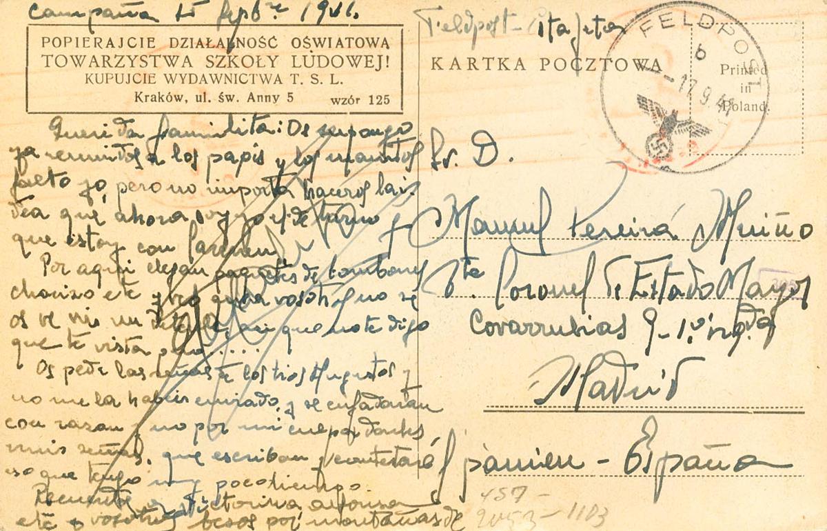1941. EN MARCHA HACIA EL FRENTE (15 de Septiembre). Tarjeta Postal polaca dirigida a MADRID, sin indicación del número de unidad (muy probablemente del Feldpost Nº11371C). Fechador FELDPOST / B, marca de rodillo en rojo y anotaciones y marcas de los censores. MAGNIFICA Y RARA.