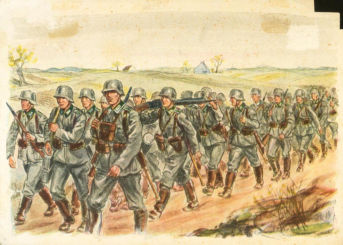1941. EN MARCHA HACIA EL FRENTE (17 de Septiembre). Tarjeta Postal ilustrada (corte en esquina) dirigida a MADRID, sin indicación del número de unidad (muy probablemente del Feldpost Nº11371-C). Fechador FELDPOST / B y sin marcas o anotaciones de censura. BONITA Y RARA.