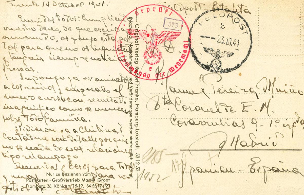 1941. FRENTE DE NOWGOROD (14 de Octubre). Tarjeta Postal de NOWGOROD a MADRID, sin indicación del número de unidad (muy probablemente Feldpost Nº11371-B). Fechador FELDPOST / B, marcas de censura, en rojo y de los censores a lápiz y estampadas. MAGNIFICA Y RARA.