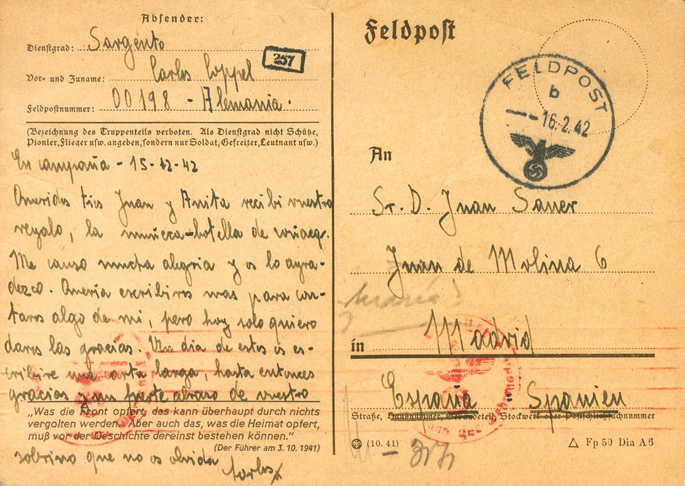 1942. FRENTE DE NOWGOROD (15 de Febrero). Tarjeta Postal FELDPOST Nº00198 (Jefatura de la División) a MADRID. Fechador FELDPOST / B, rodillo de censura, en rojo y marca del censor. MAGNIFICA Y RARA.