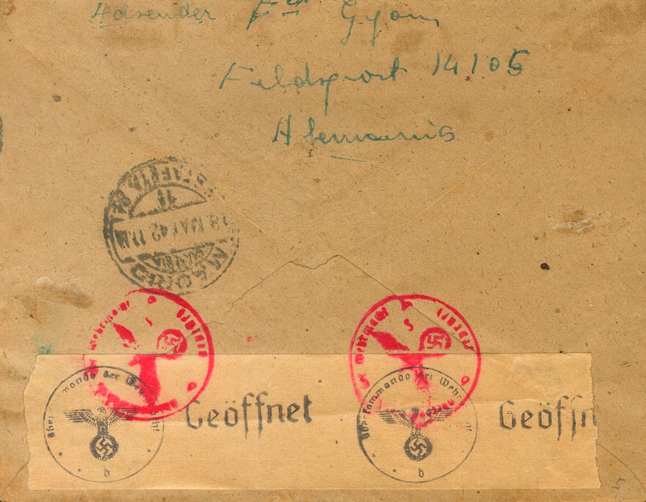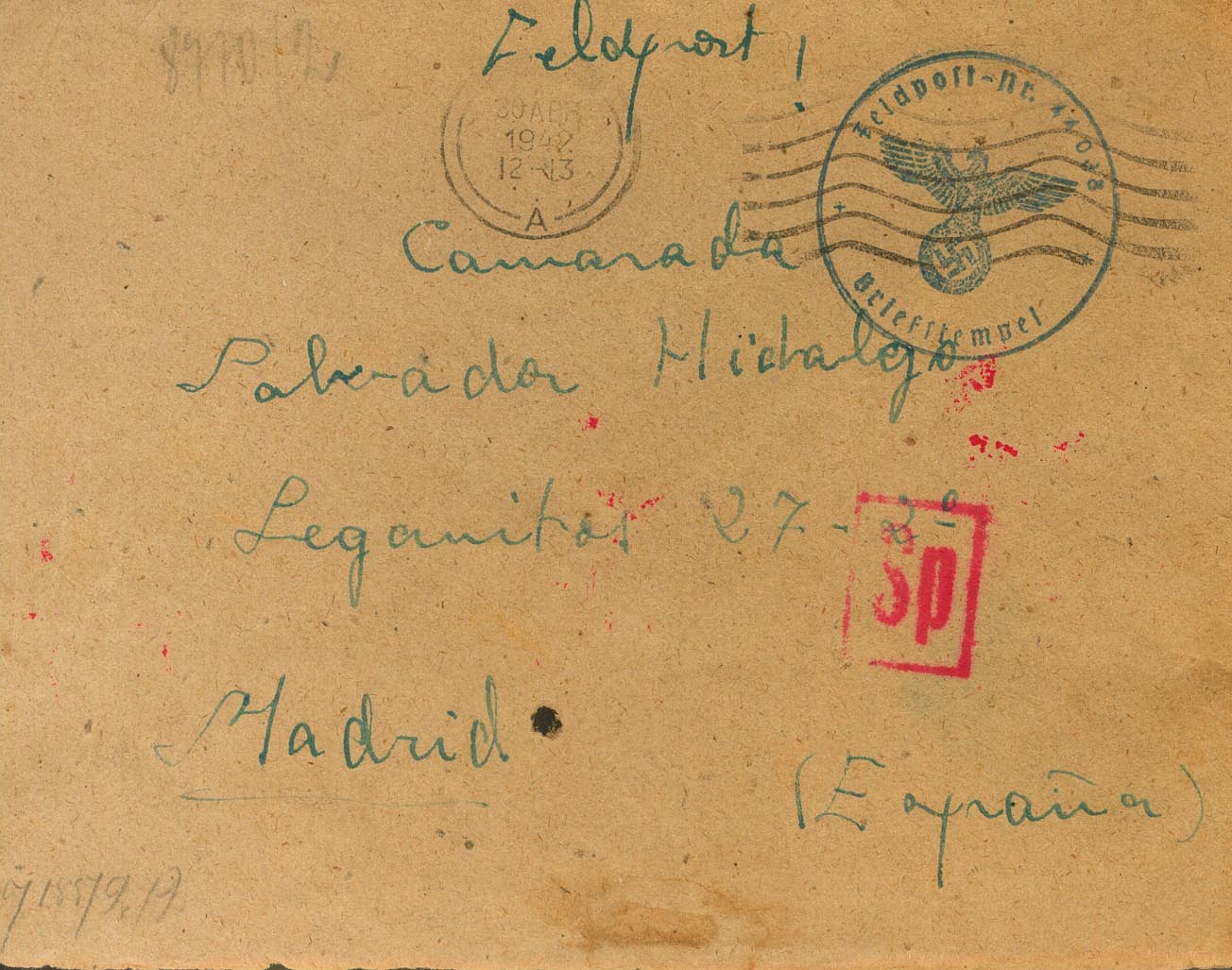 1942. FRENTE DE NOWGOROD-HOSPITAL DE RIGA (30 de Abril). FELDPOST Nº14105 (Hospital de Riga) a MADRID. Fechador de rodillo y marcas FELDPOST NR.44088 (BRIEFTEMUEL), en azul y SP (pequeño), en rojo y al dorso llegada. MAGNIFICA Y RARA, REMITIDA POR UN SOLDADO INTERNADO EN EL HOSPITAL ESPAÑOL DE RIGA.