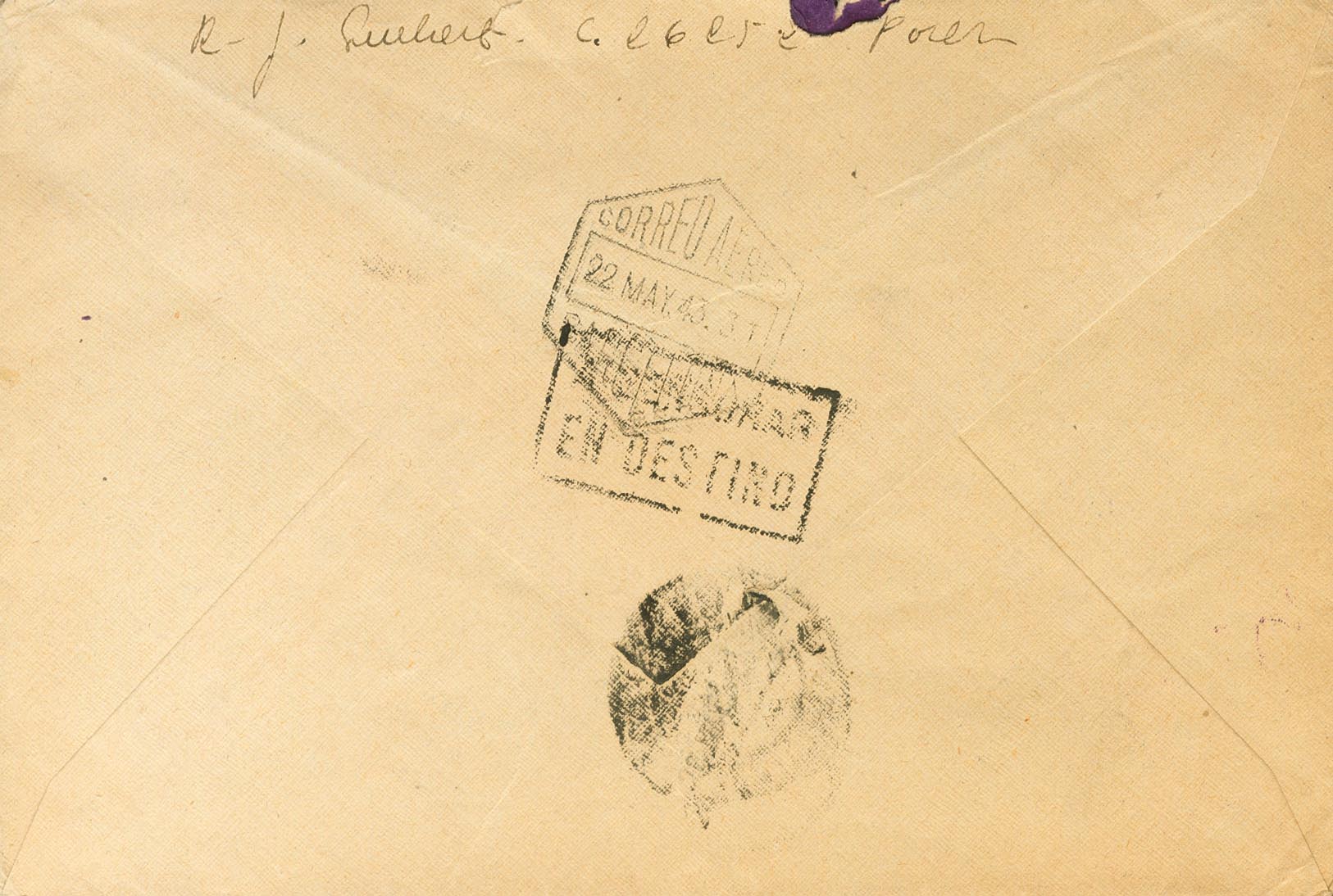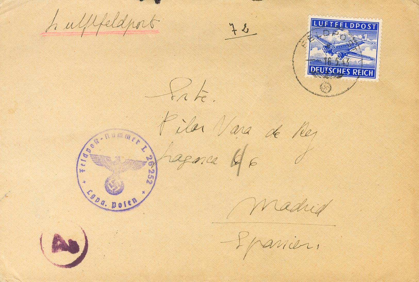 1943. ESCUADRILLA AZUL (16 de Mayo). Sello de franquicia alemán. POSEN a MADRID, remitida por el Alférez Piloto Javier Mª Guibert, de la 3ª Escuadrilla. Matasello FELDPOST / E y en el frente marcas "AB" y FELDPOST-NUMMER L26252 / LGPA POSEN, correspondiente a la unidad Jagdgeschwader 51, una de las alas de combate alemán donde se integró la Escuadrilla Azul. MAGNIFICA Y RARISIMA.