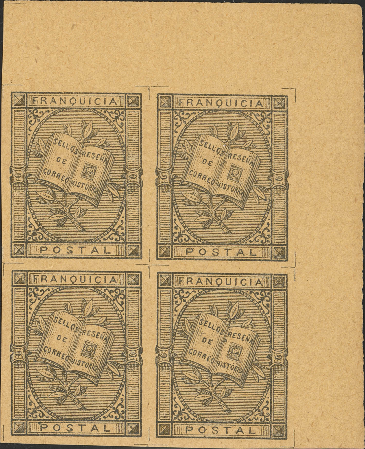 (★) 7(4). 1881. Sin cifra del valor, negro sobre anteado, bloque de cuatro, esquina de pliego. MAGNIFICO. Edifil 2017: 240 Euros