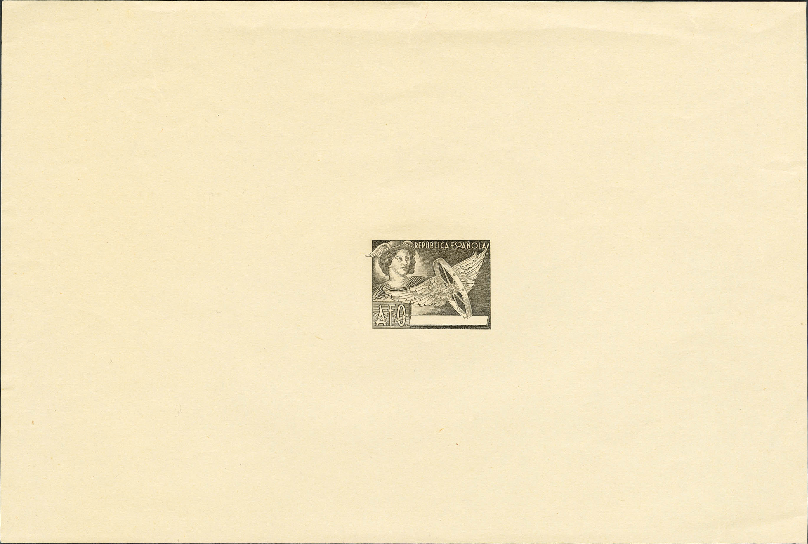 (★)1938. Sin cifra del valor, negro. PRUEBA DE PUNZON, con grandes márgenes y sin leyenda "FRANQUICIA". MAGNIFICA.