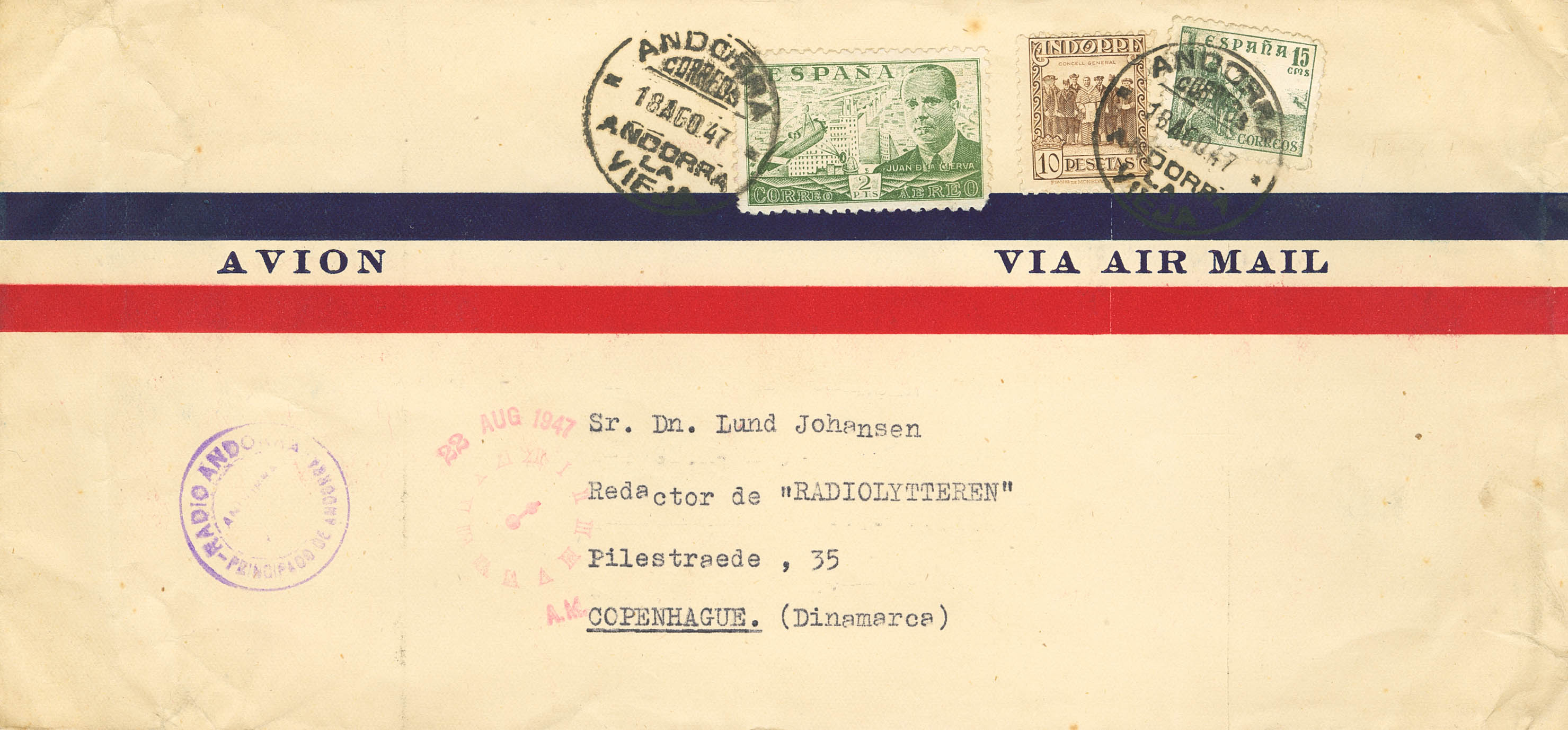 43. 1947. 10 pts castaño y sellos de España de 15 cts verde y 2 pts verde. ANDORRA LA VIEJA a COPENAGUE (DINAMARCA). Al dorso tránsito. MAGNIFICA.