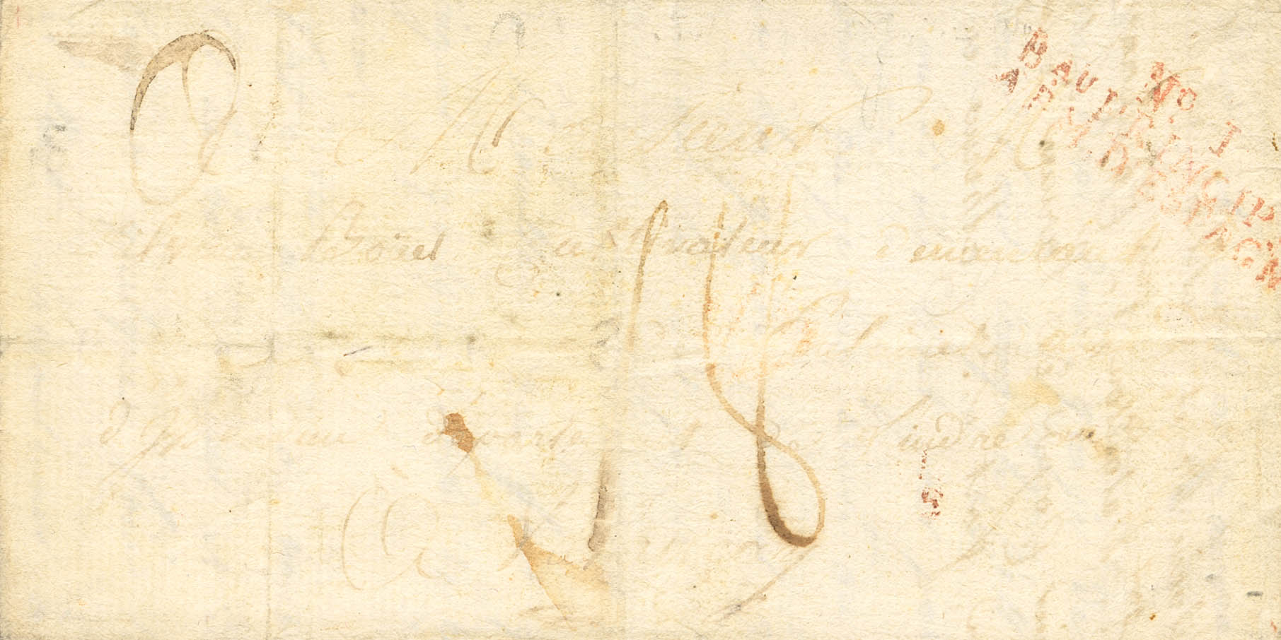 1810. (17 de Julio). PUERTO DE SANTA MARIA (FUERTE DE SANTA CATALINA) a CAMBRAY (FRANCIA). Marca Nº1 / BAU PRINCIPAL / ARM. D´ESPAGNE, en rojo (Tizón IX-76), este fuerte fue destruido por los españoles en los primeros meses de 1810 para evitar que los franceses lo utilizaran contra Cádiz y reconstruido por los franceses para su uso. BONITA Y RARA.
