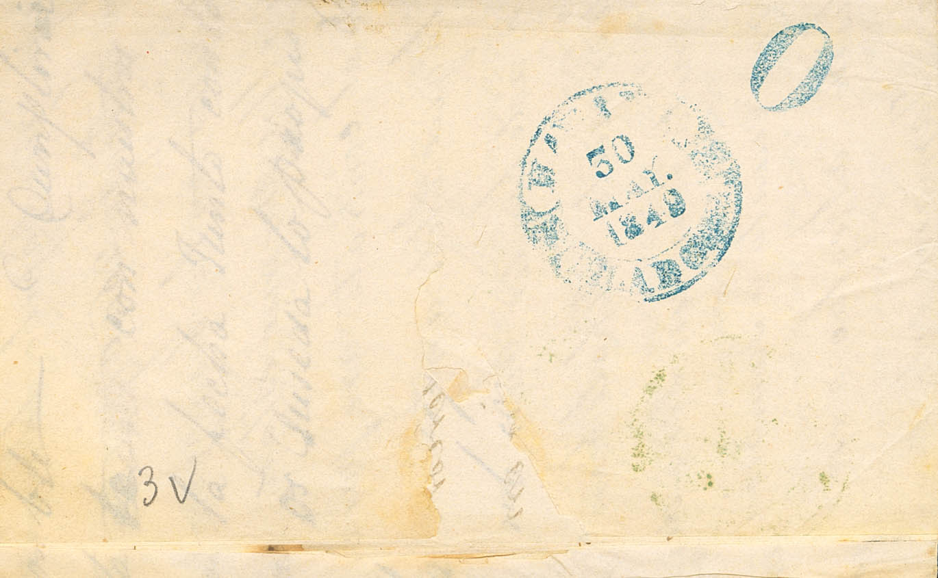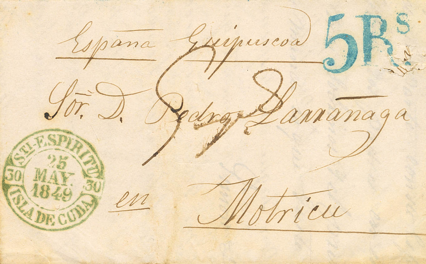 1849. SANCTI SPIRITUS a MOTRICO (GUIPUZCOA). Baeza STI.ESPIRITU / ISLA DE CUBA, en verde. MAGNIFICA ESTAMPACION Y RARA.