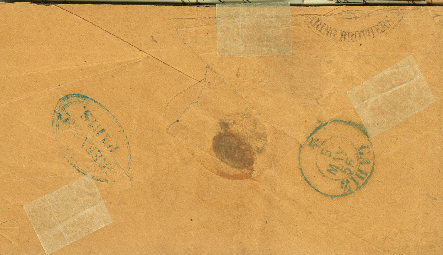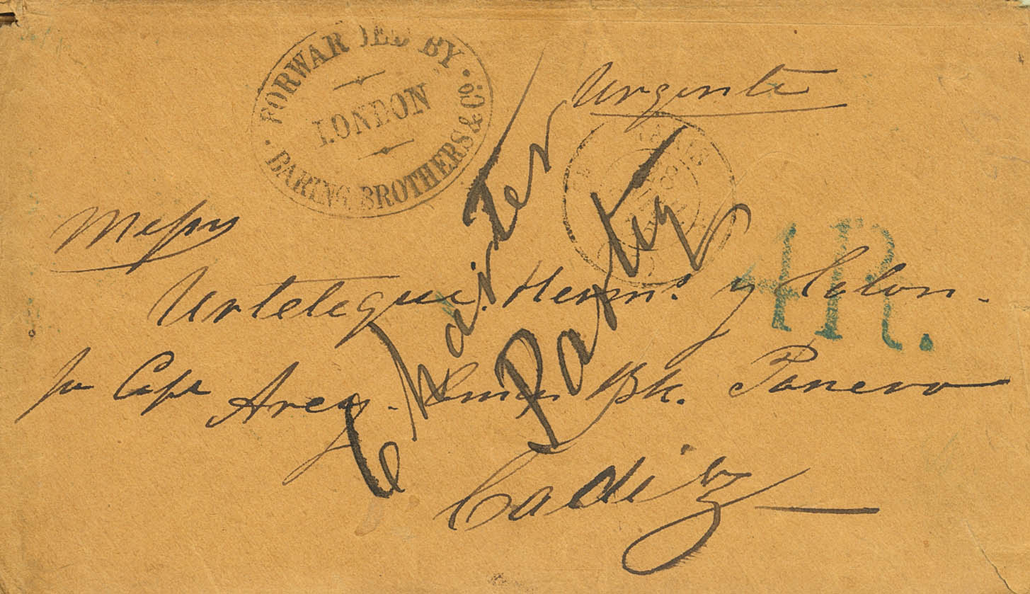 1855. LA HABANA a CADIZ. Marca del encaminador FORWARDED BY / LONDON / BARING BROTHERS AND Cº y anotaciones manuscritas "Urgente" y "Charter Party" (flete marítimo), al dorso marca de encaminador francés GREEN ETC. / PARIS, en azul (en el interior flete de mercancias completo). MAGNIFICA Y MUY RARA CON DOBLE ENCAMINADOR.