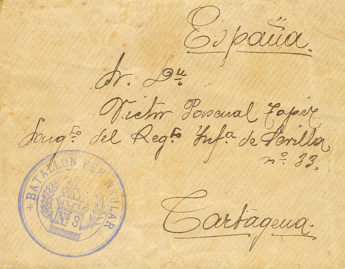 1895. ISLA DE CUBA a CARTAGENA (MURCIA). En el frente marca militar BATALLON PENINSULAR / Nº3, en azul (este batallón pertenecía a Alcantara, y fue el primero en embarcar hacia Cuba desde el puerto de Valencia). MAGNIFICA E INTERESANTE DOCUMENTO HISTORICO DE LA GUERRA DE LA INDEPENDENCIA DE CUBA.