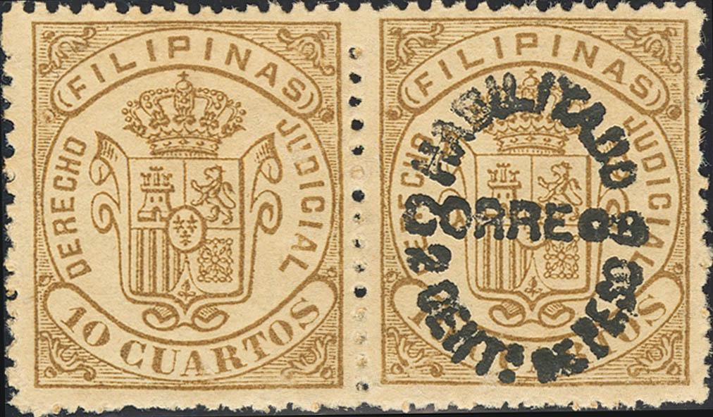 ★ 66J(2). 1881. 2 ctvos sobre 10 cuartos sepia, pareja. Variedad UN SELLO SIN SOBRECARGA. MAGNIFICA Y RARA.