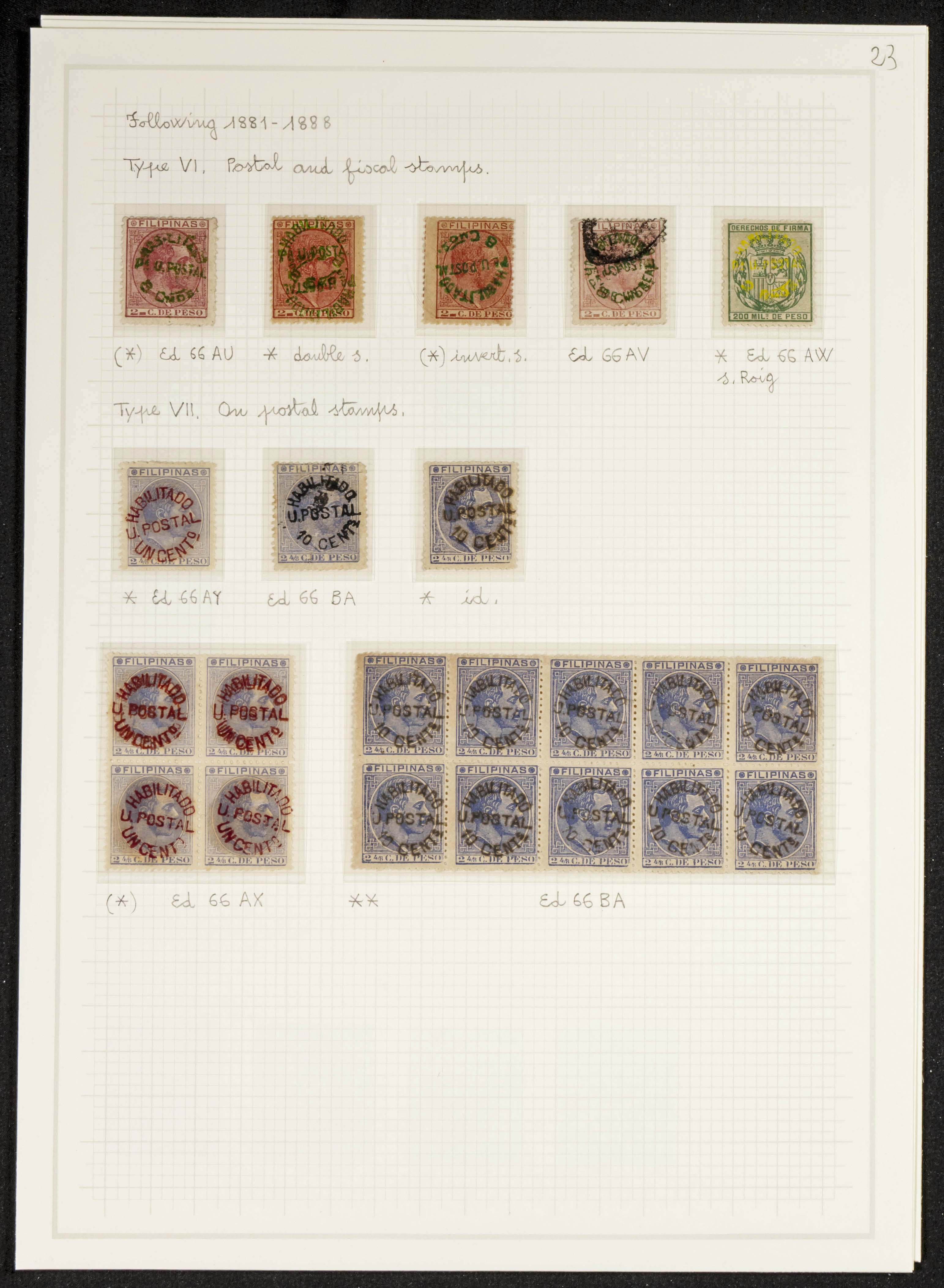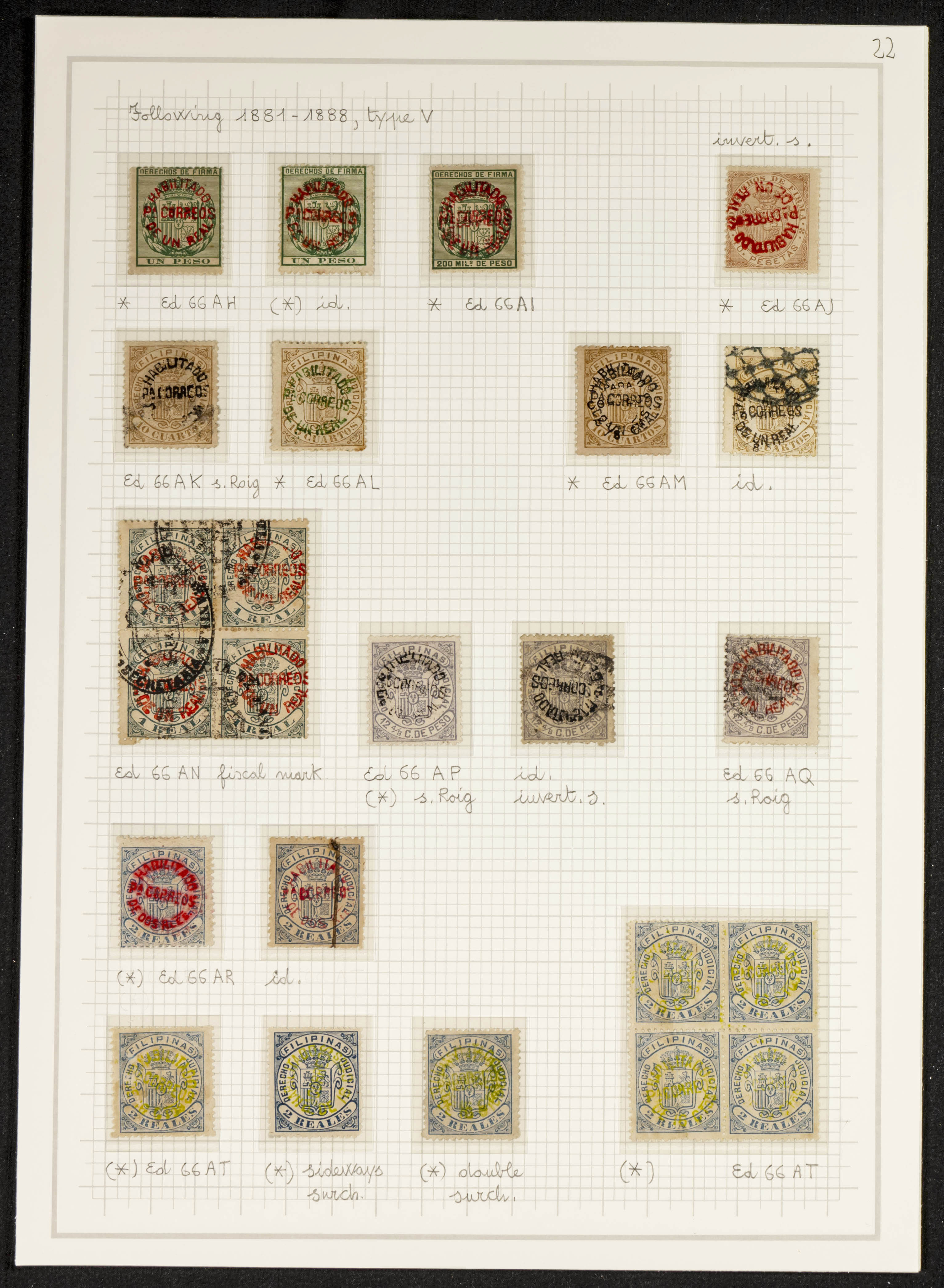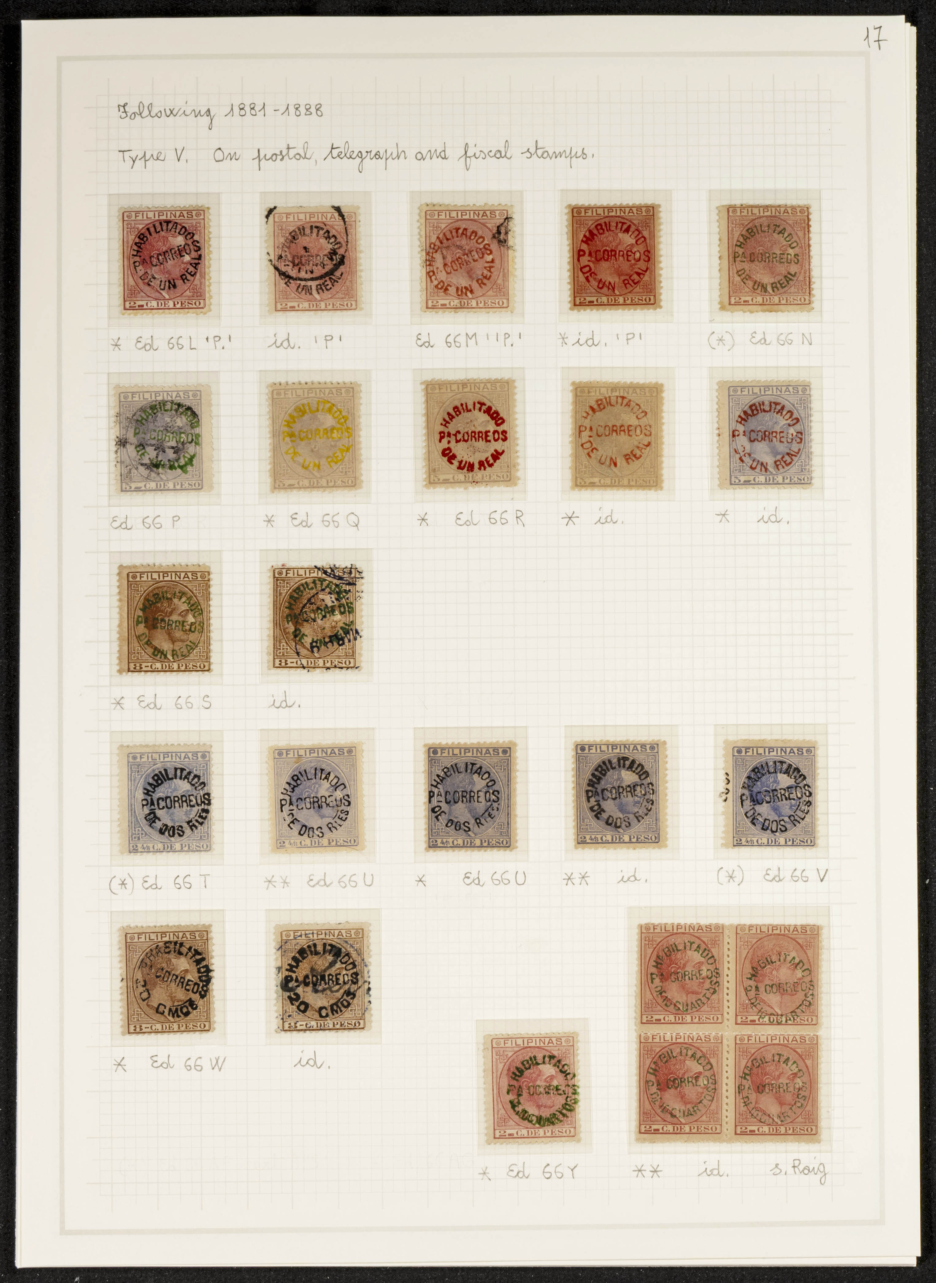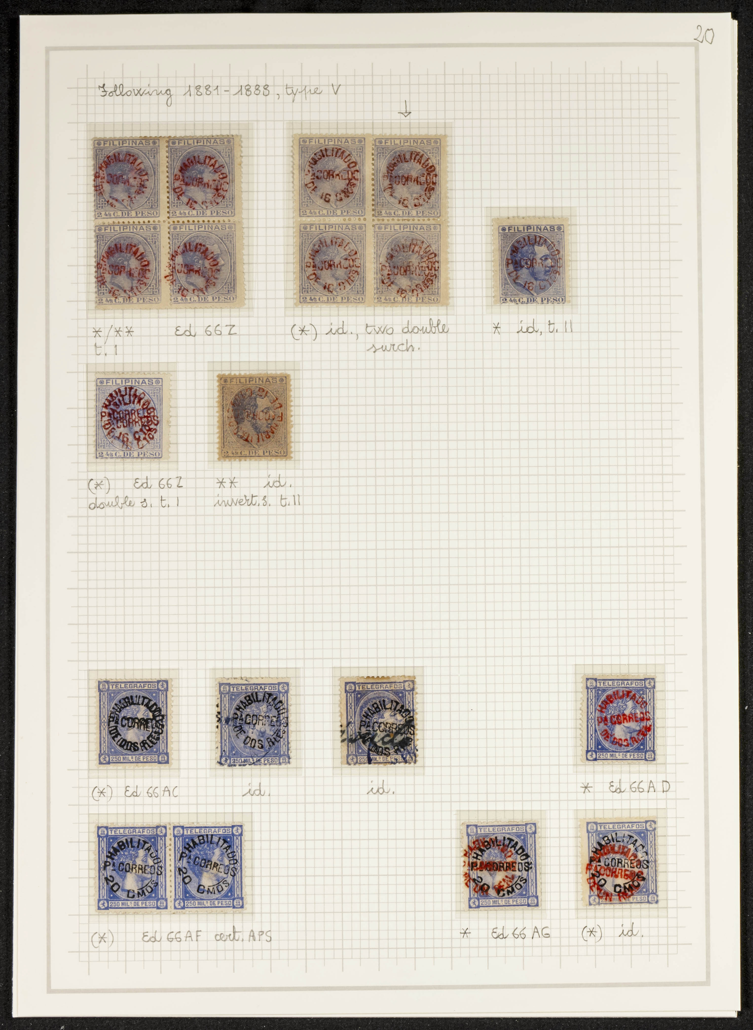 ★/1881. Interesante conjunto-estudio de la emisión provisional de 1881-88 de Filipinas con sobrecargas HABILITADO de diversos tipos, en nuevo y usado e incluyendo numerosas variedades de sobrecarga (dobles, invertidas, tumbadas, un sello sin sobrecarga o cambios de color), así como algún bloque. IMPRESCINDIBLE EXAMINAR.