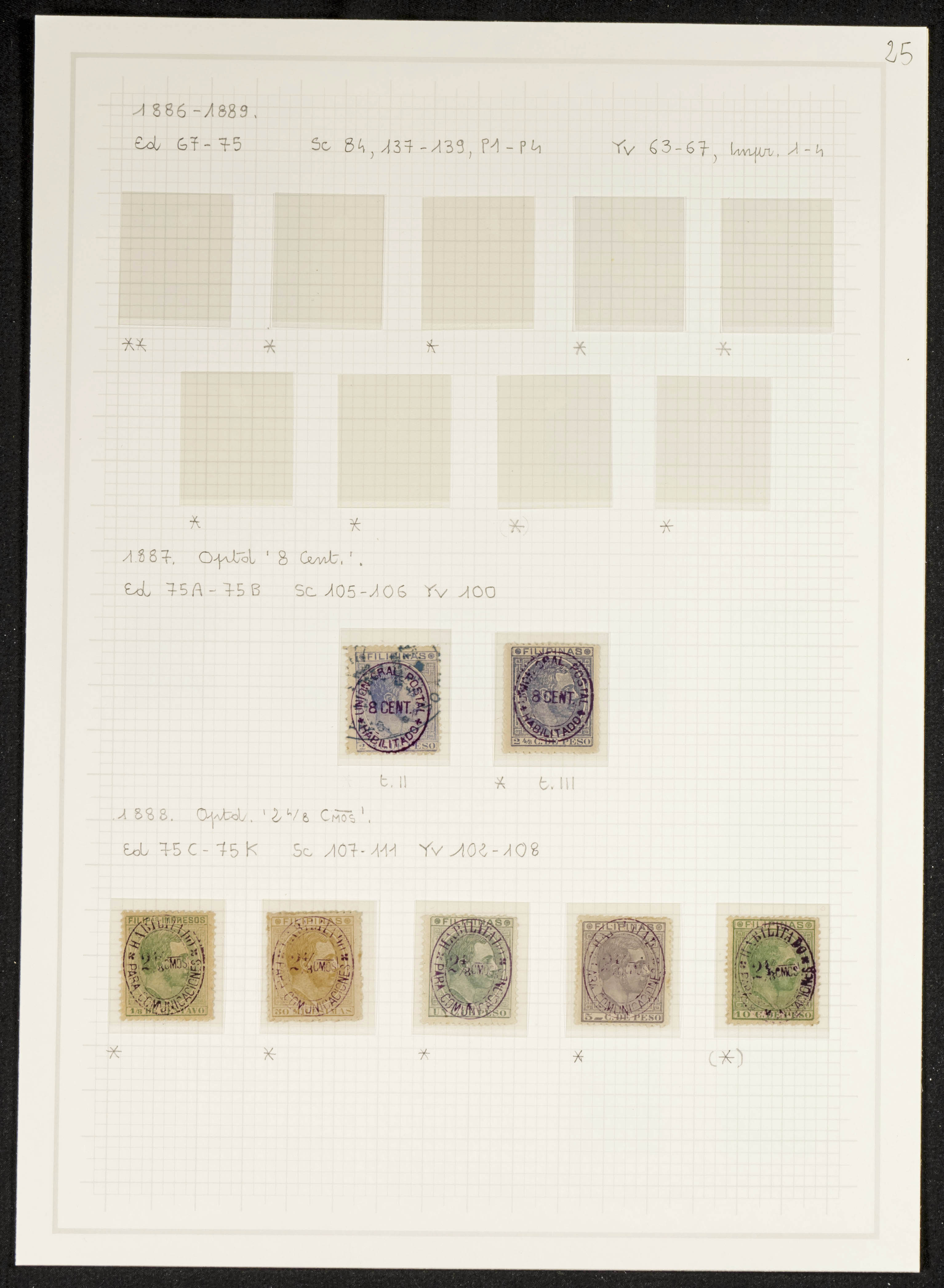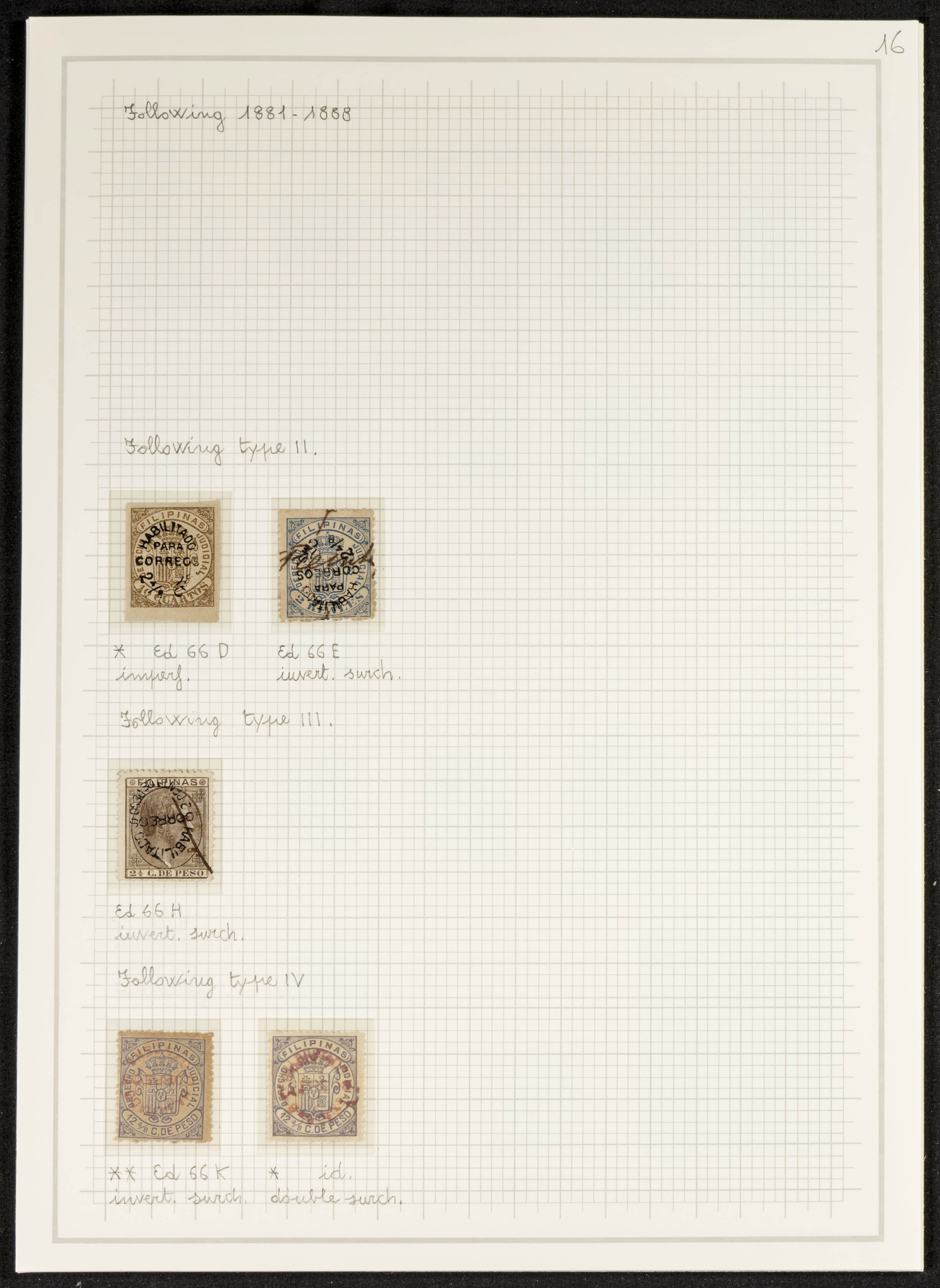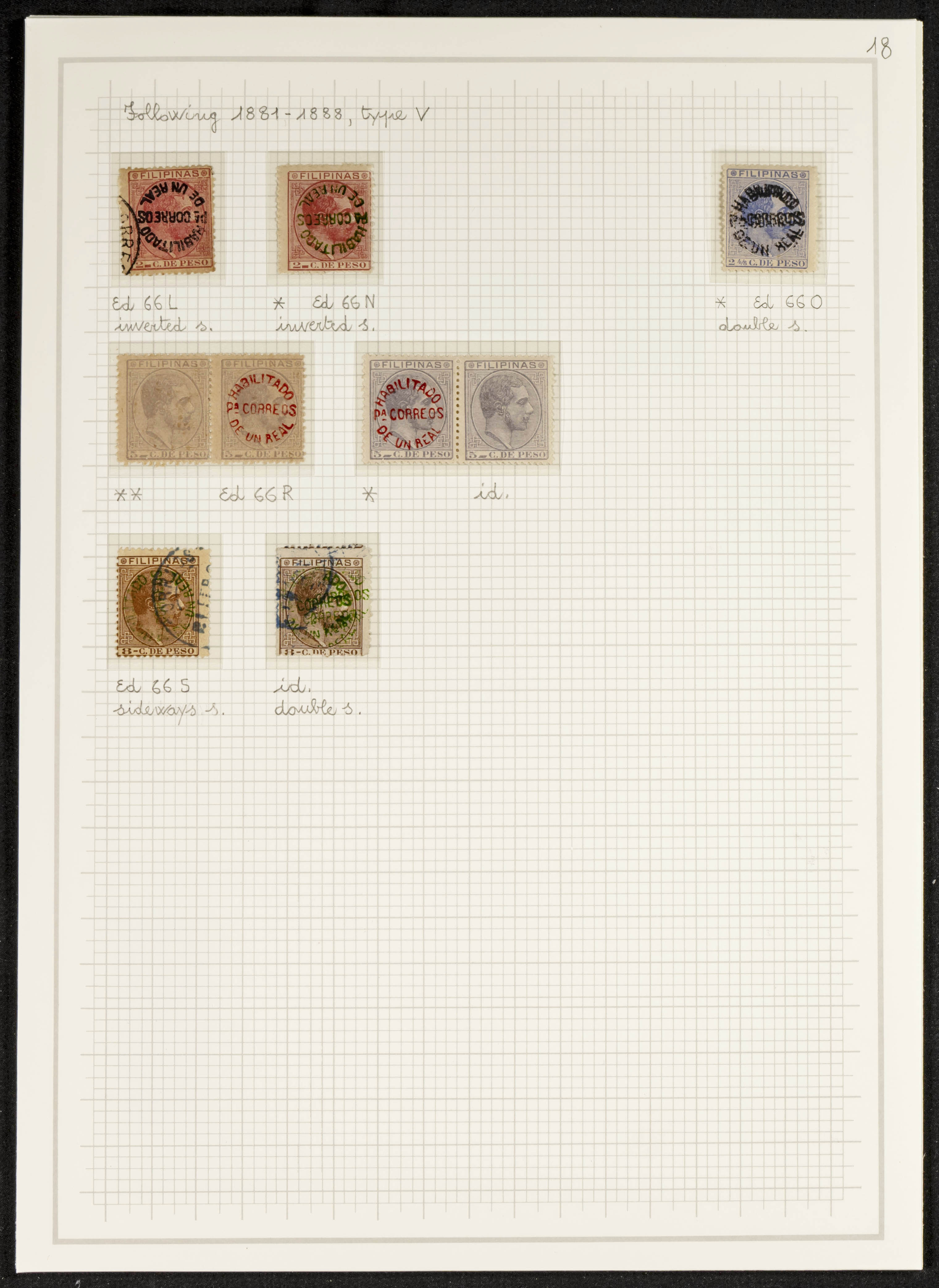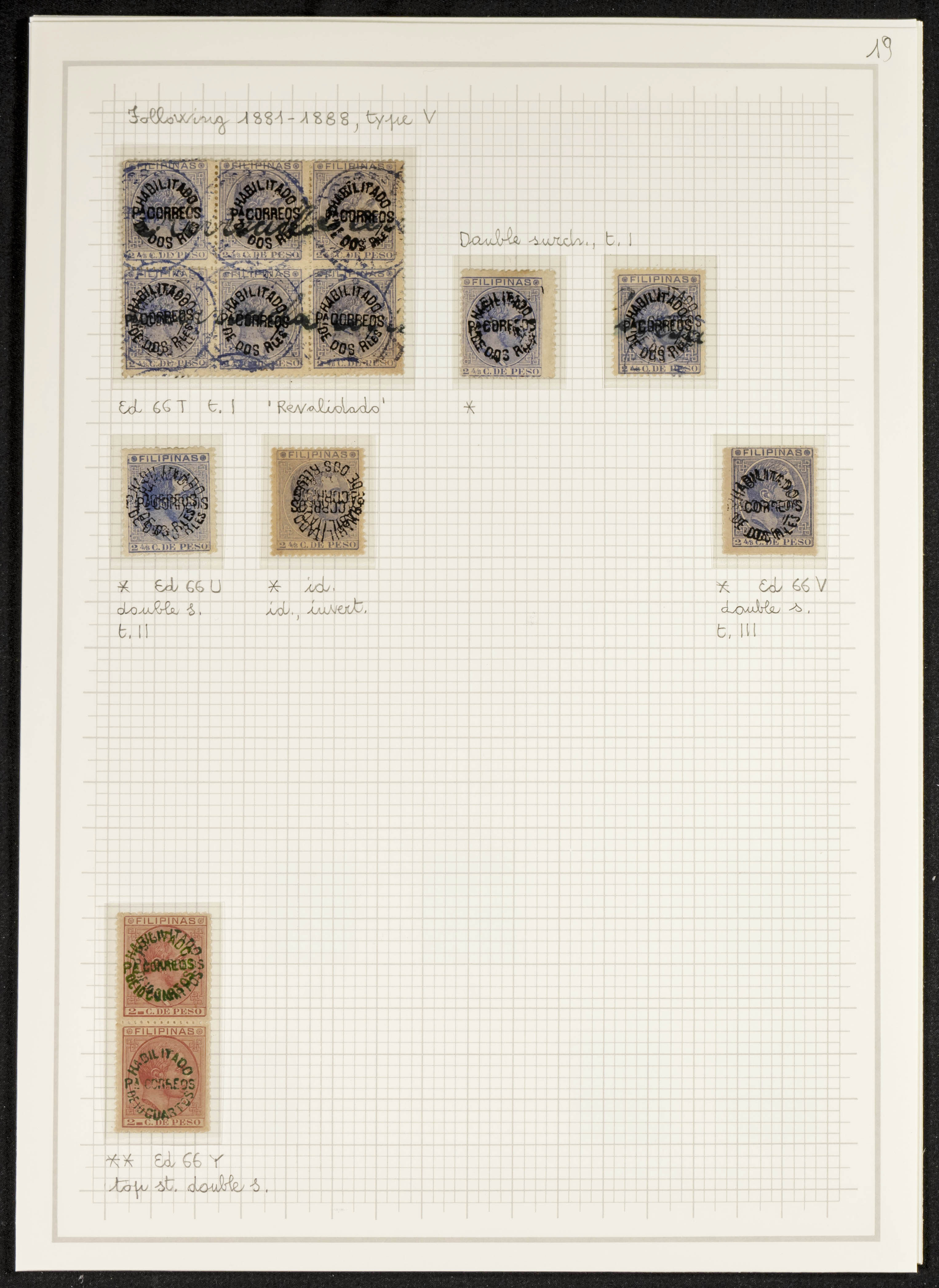 ★/1881. Interesante conjunto-estudio de la emisión provisional de 1881-88 de Filipinas con sobrecargas HABILITADO de diversos tipos, en nuevo y usado e incluyendo numerosas variedades de sobrecarga (dobles, invertidas, tumbadas, un sello sin sobrecarga o cambios de color), así como algún bloque. IMPRESCINDIBLE EXAMINAR.