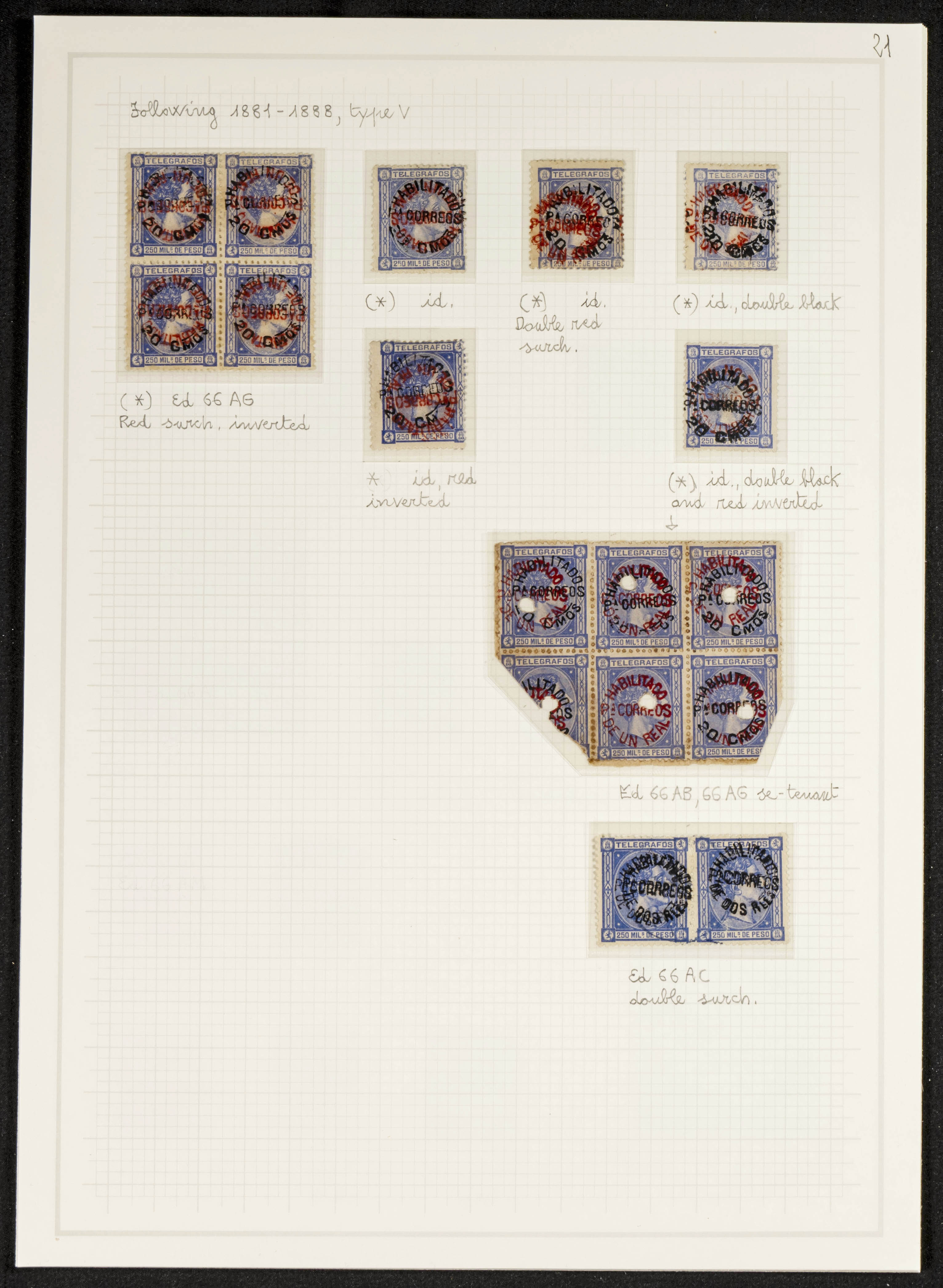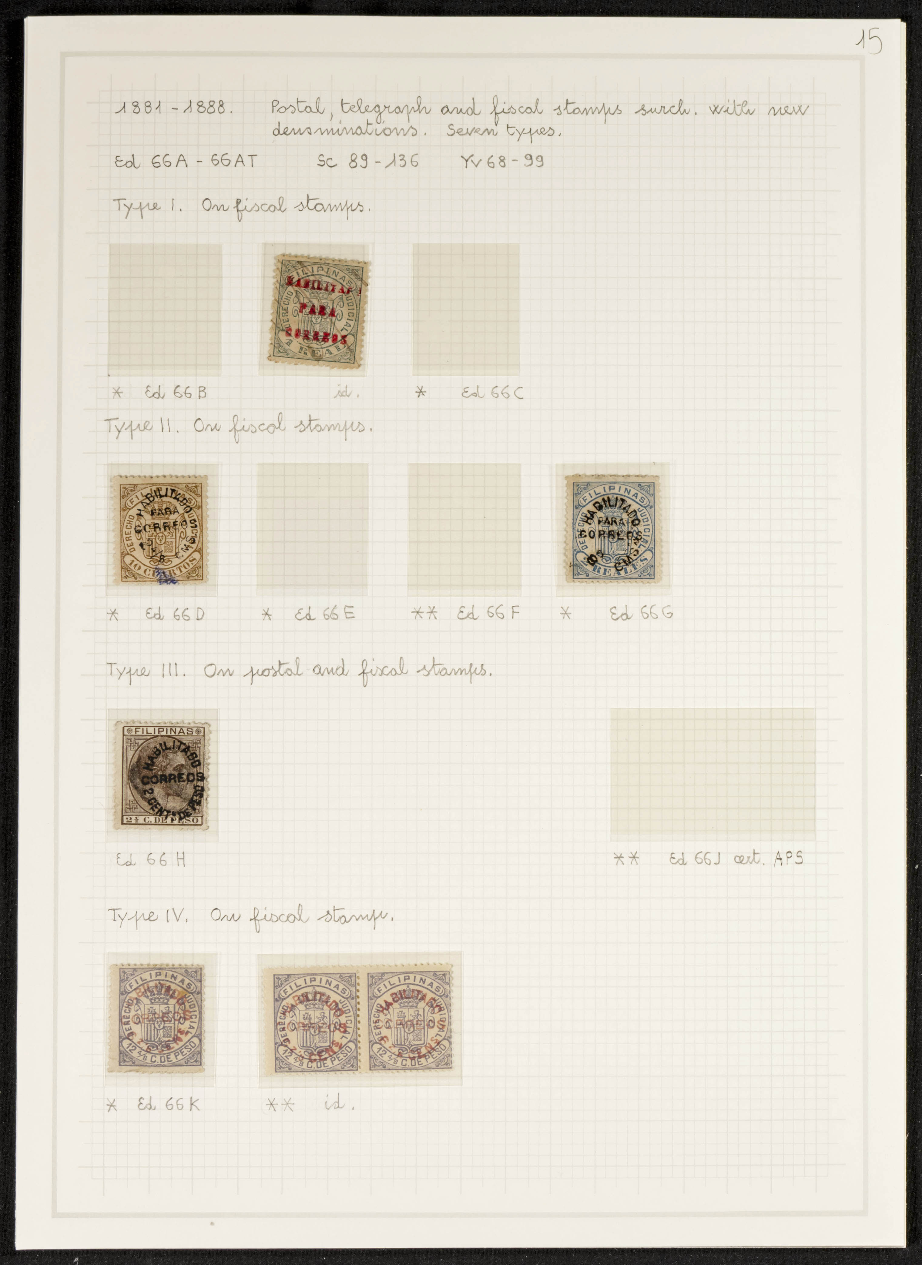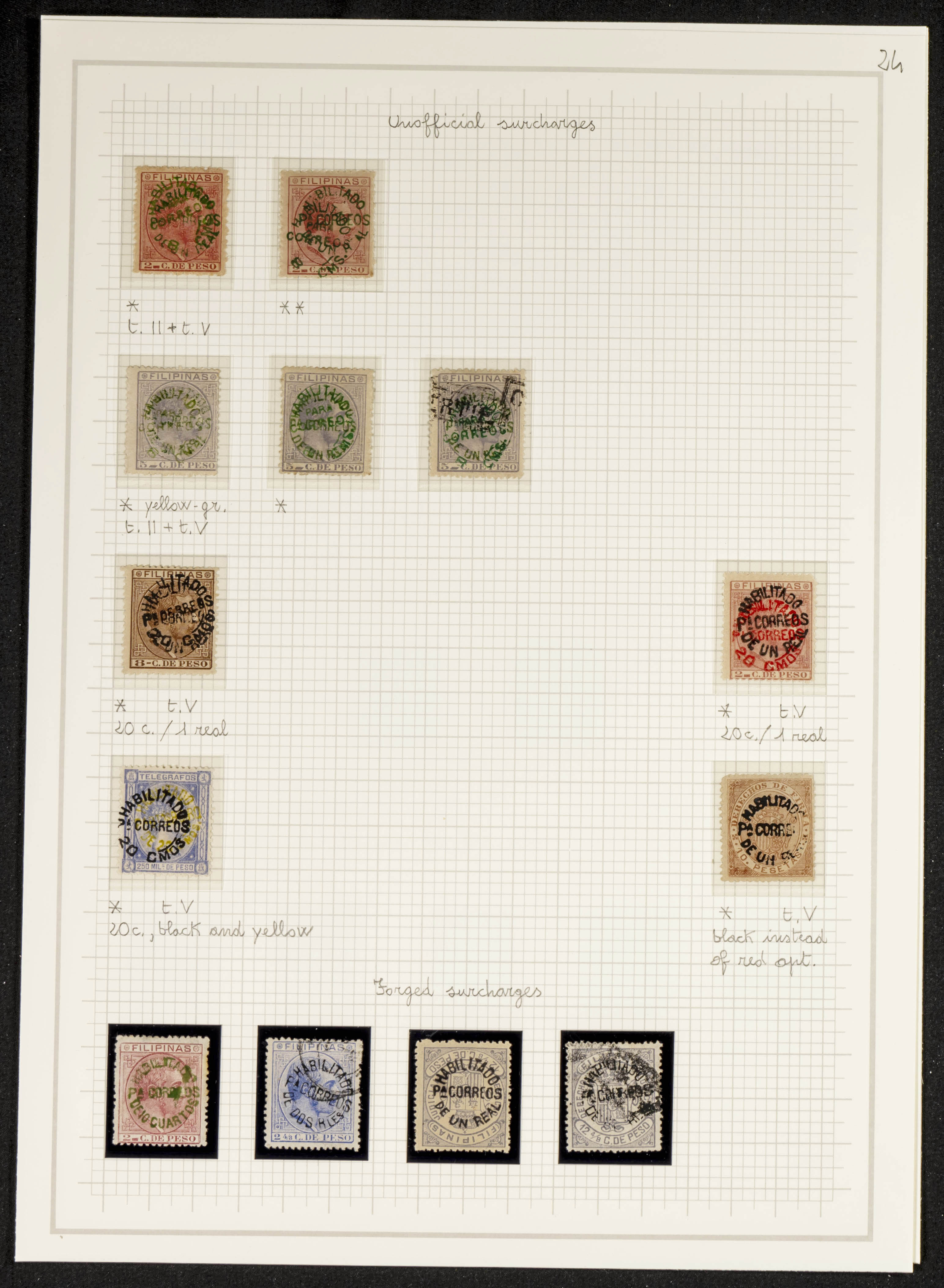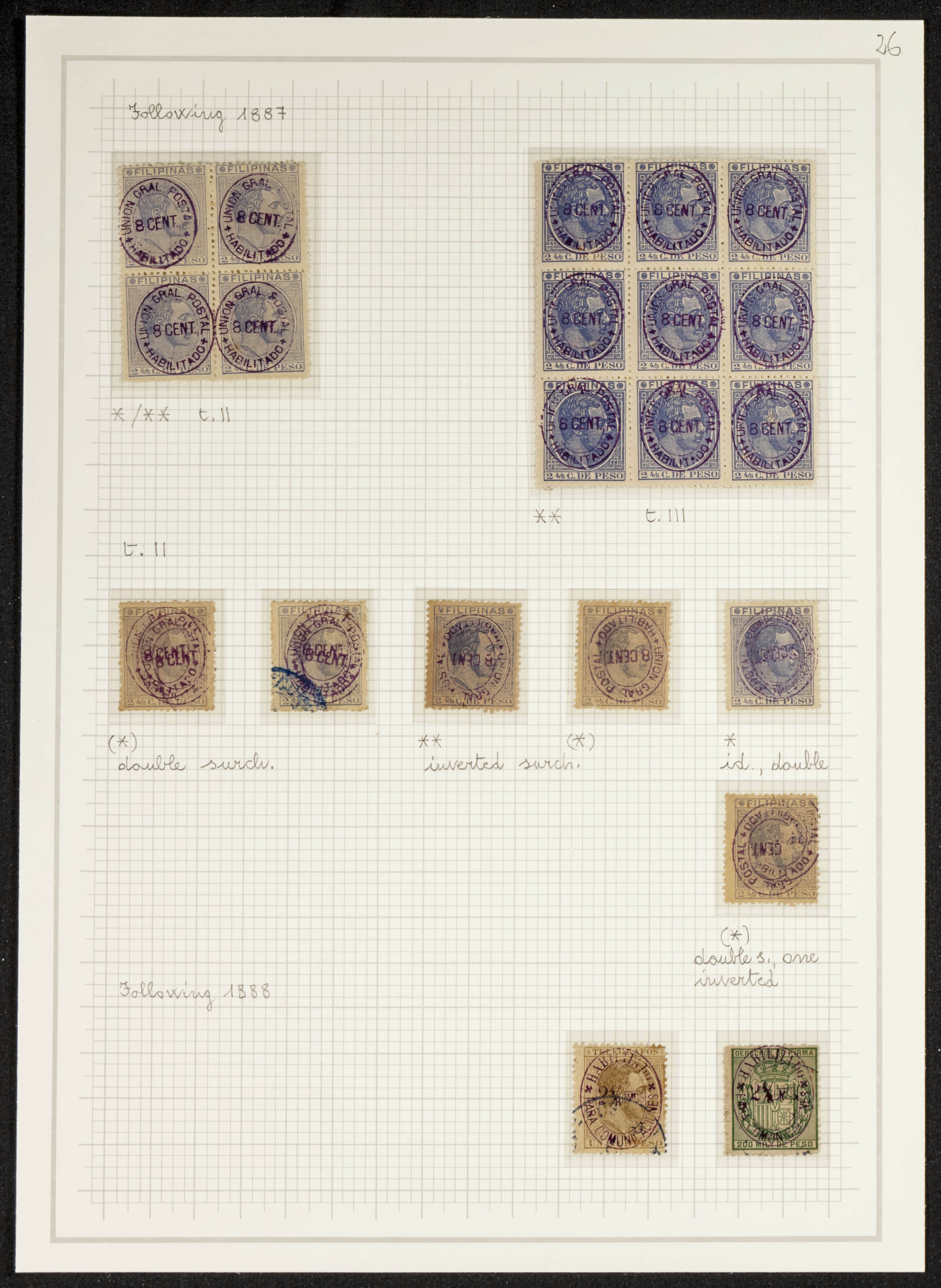 ★/1881. Interesante conjunto-estudio de la emisión provisional de 1881-88 de Filipinas con sobrecargas HABILITADO de diversos tipos, en nuevo y usado e incluyendo numerosas variedades de sobrecarga (dobles, invertidas, tumbadas, un sello sin sobrecarga o cambios de color), así como algún bloque. IMPRESCINDIBLE EXAMINAR.