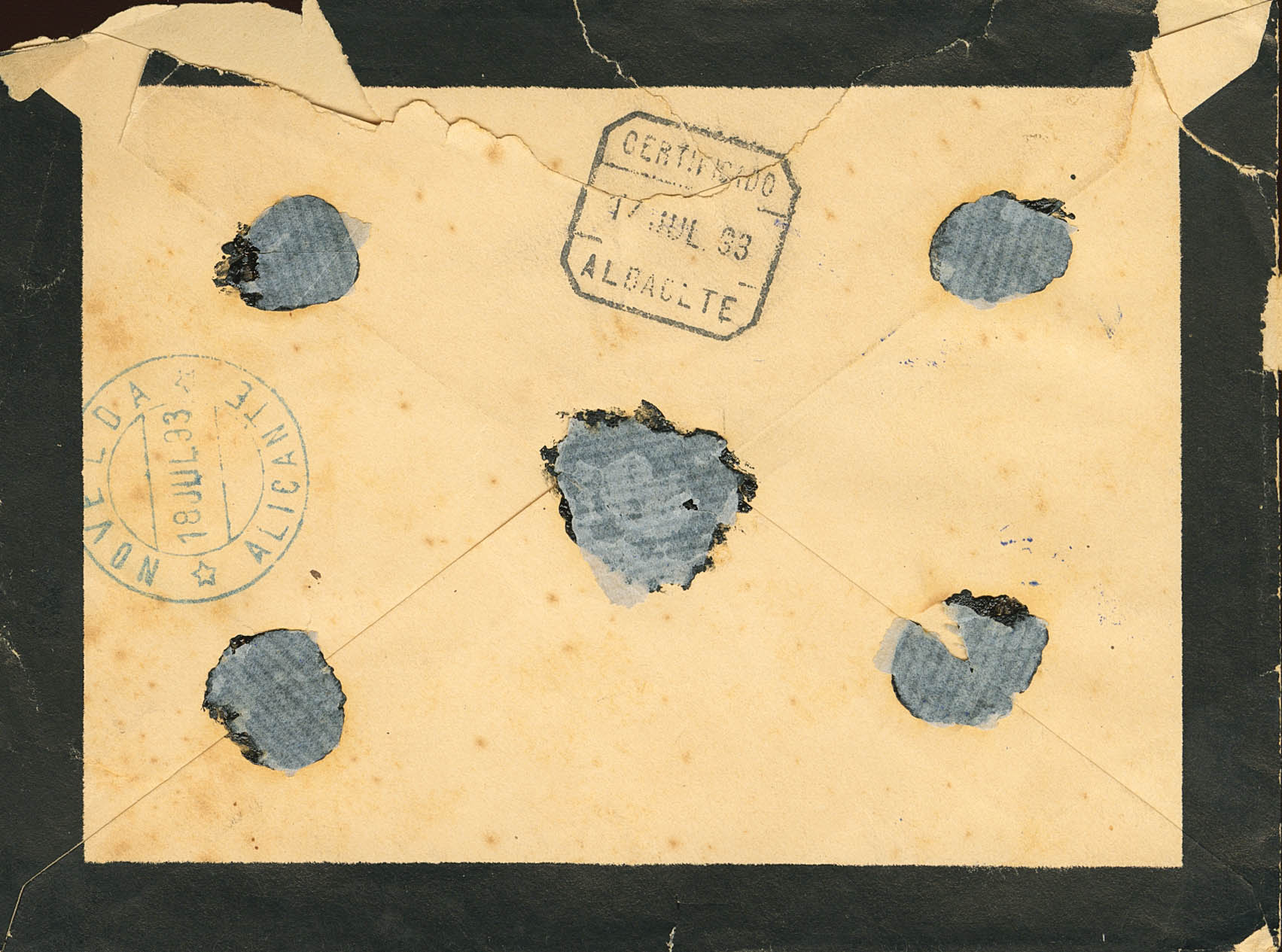 99(2), 101. 1893. 10 cts carmín, pareja y 15 cts castaño. Certificado de ILOILO (FILIPINAS) a NOVELDA (ALICANTE). Matasello COMUNICACIONES / ILOILO, en azul y en el frente marca CERTIFICADO, en azul, al dorso diversos tránsitos y llegada a Novelda. MAGNIFICA Y MUY RARA. Cert. GRAUS.