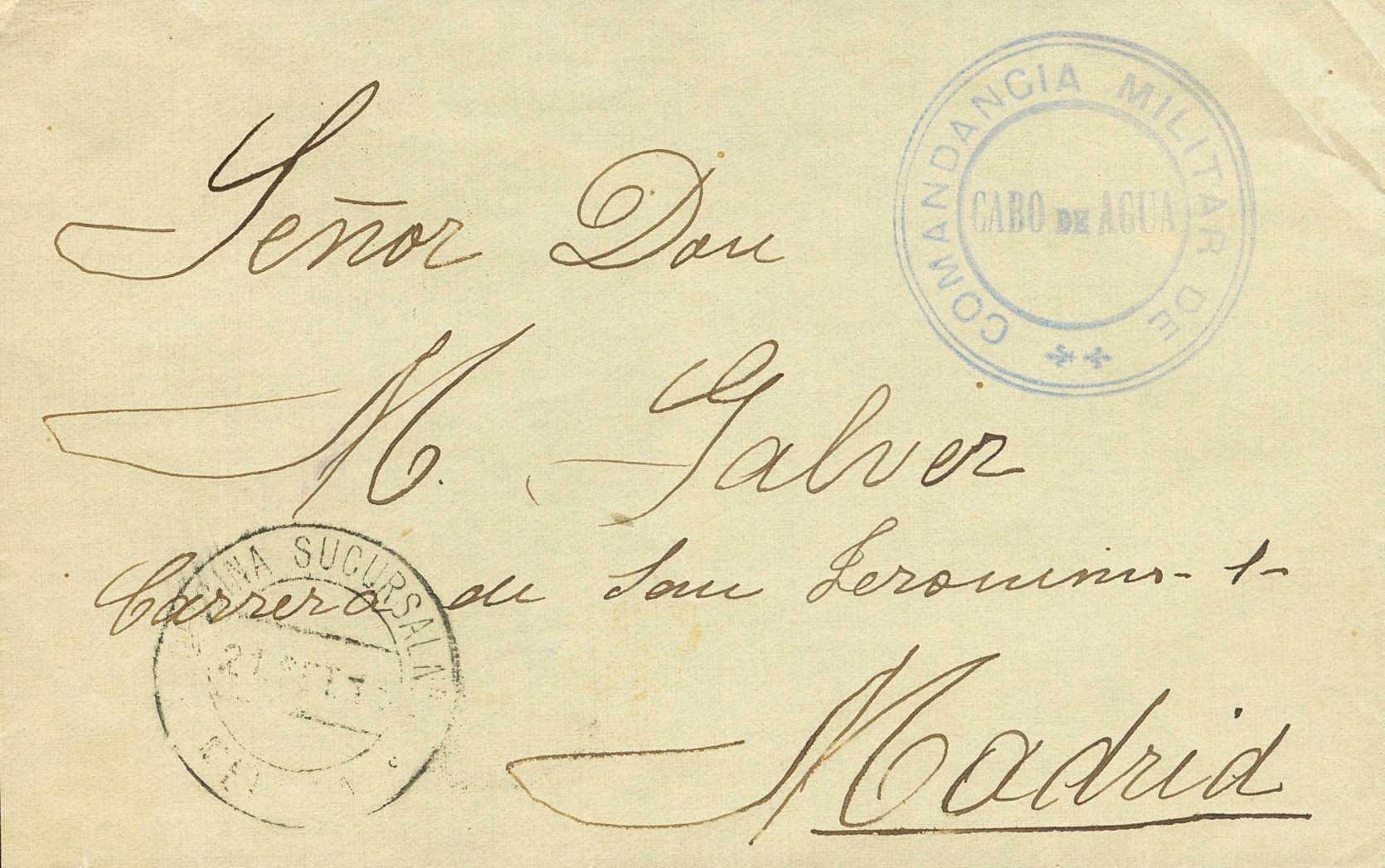 1914. MELILLA a MADRID. Marca COMANDANCIA MILITAR DE / CABO DE AGUA, en violeta y al dorso llegada. MAGNIFICA Y RARA.